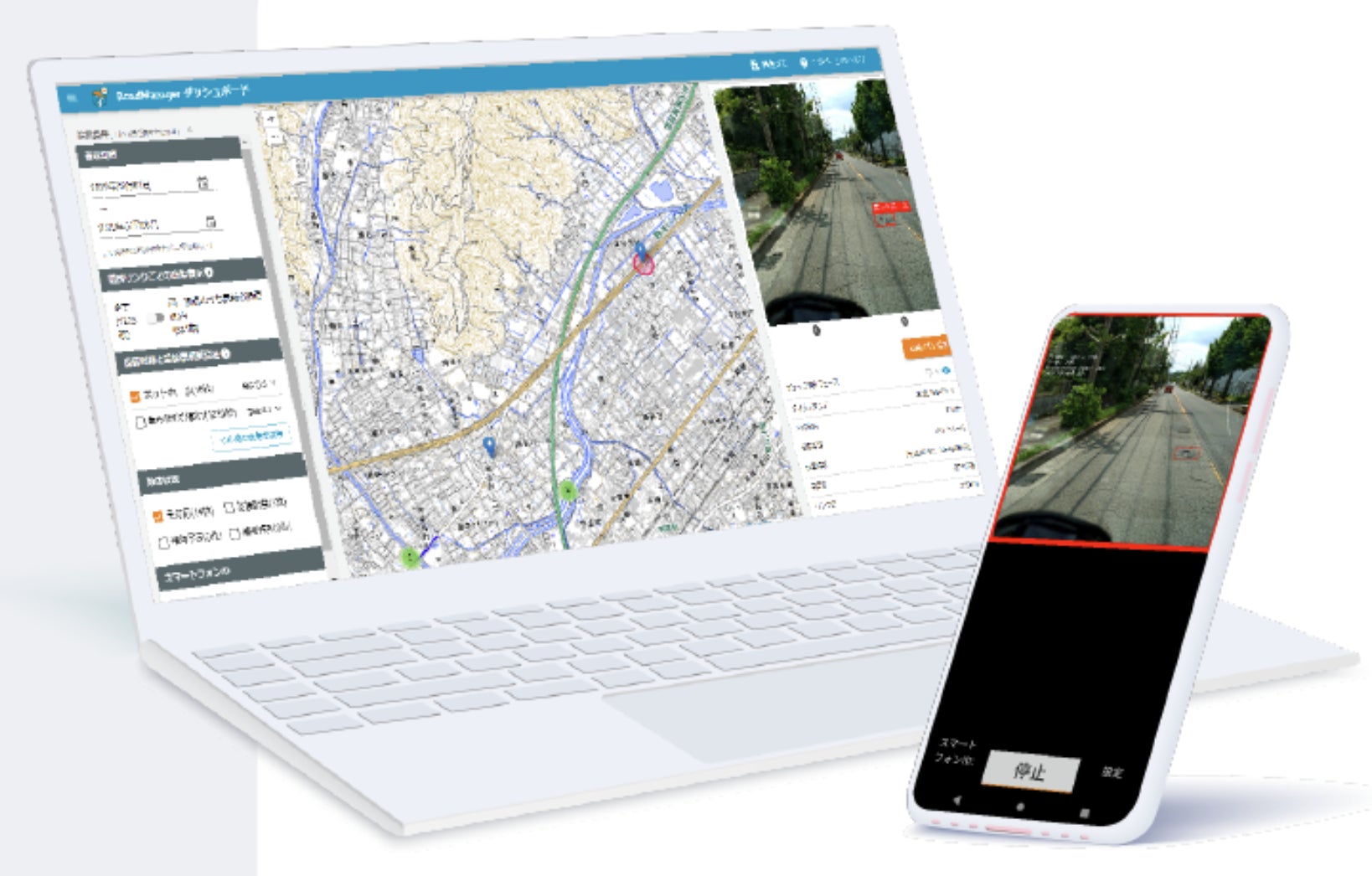 「路面性状簡易評価パッケージ」は、生活道路の状態を把握して補修計画の根拠づくりをしたい道路管理者向けに、スマートフォンやカメラ付きデバイスを用いて路面のひび割れや段差を測定し、独自のAI技術を用いてデータの解析を行い、ひび割れ率やIRI(平坦性)を算出するサービスです。