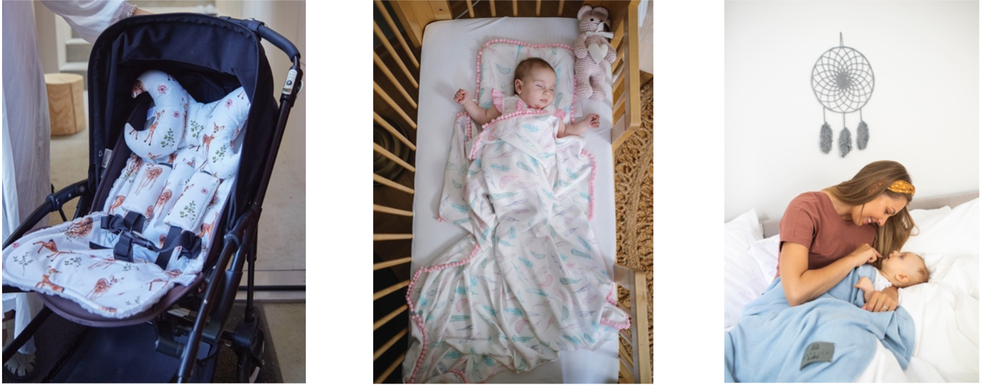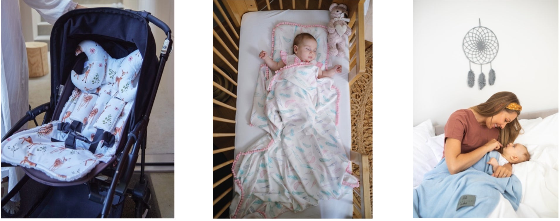 画像左 : 3Dベビーカーパッド¥14,520-(税込)/ ベビーヘッドサポート ¥6,490 / ベルトカバー ¥3,410-(税込)