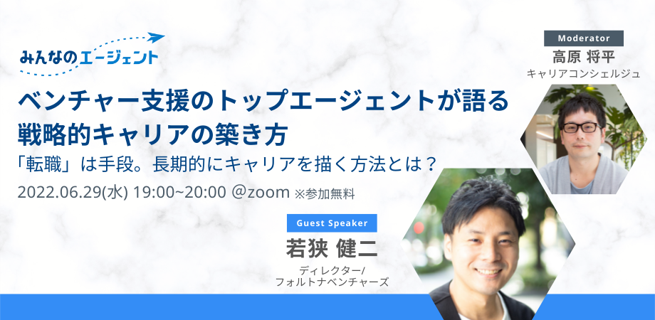 株式会社みんなのエージェントが6/29 (水)19:00〜に開催するイベント『国内有力エージェントからキャリアについて学ぶ #1「 ベンチャー支援のトップエージェントが語る 戦略的キャリアの築き方」』に、弊社フォルトナベンチャーズ・ディレクターの若狭健二が登壇いたします。