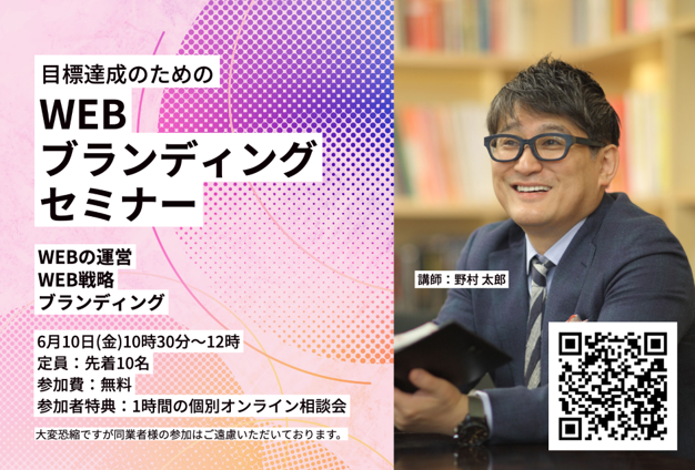 (株)スタイルメント代表の野村太郎が25年間のブランディング事業で培ってきたノウハウを1時間半に凝縮してお伝えします。参加者特典として1時間の無料相談会を別途用意しています。セミナーでWEB戦略の概要を押さえていただいた上で、相談会で事業の現状に応じた具体的なアドバイスを提供します。