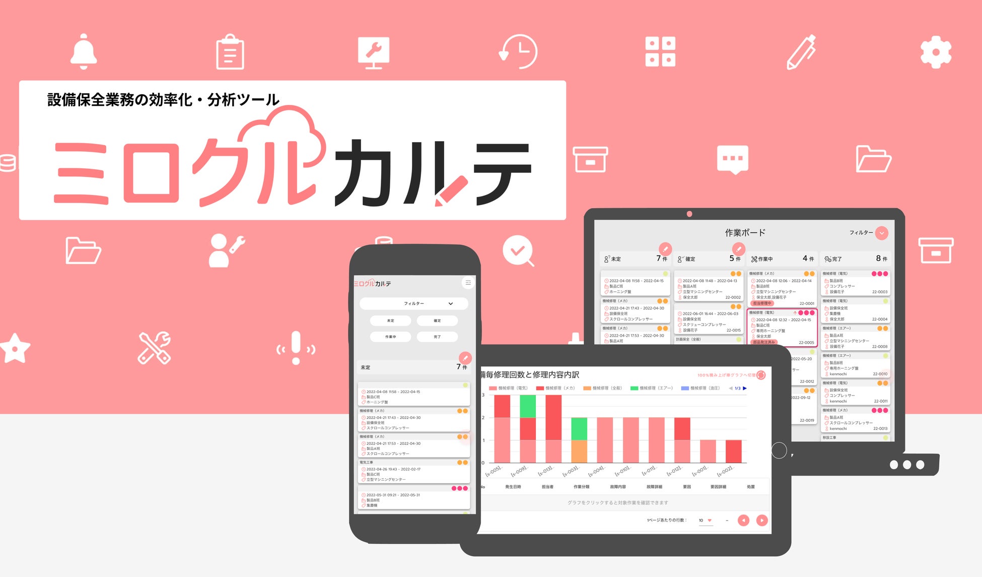 ミロクルカルテは設備保全業務の全体最適化を支援するクラウドサービスです。ダッシュボードで保全業務を見える化するとともに、故障の原因や保全費用など各種データをクラウド上に記録し、蓄積されたデータを活用することで、設備を止めない・設備停止時間を最小限にすることを目指します。