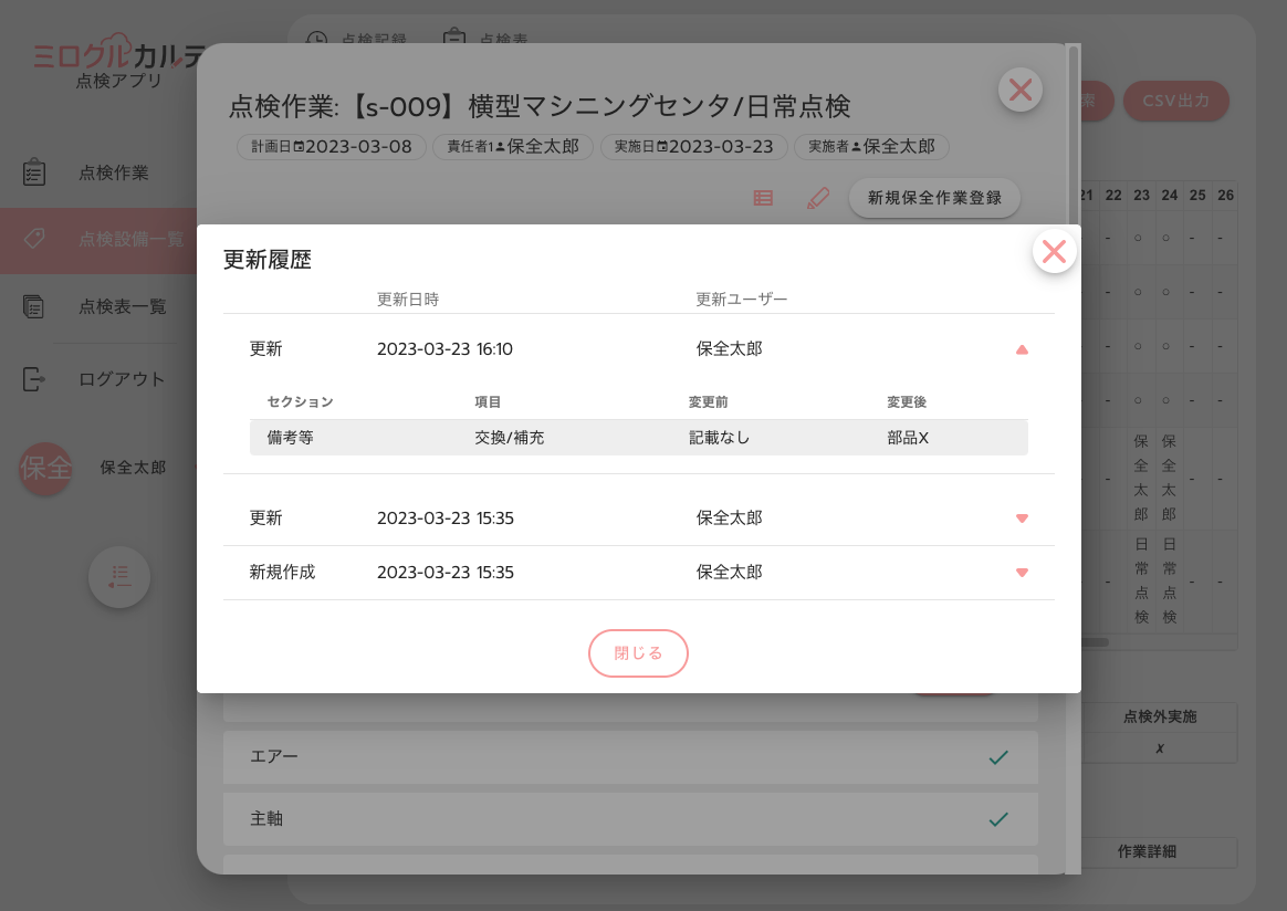 設備の安全性や稼働率を維持するために、定期的な点検業務は不可欠であり、点検忘れや異常の報告漏れによる設備停止や事故は避けなければいけません。ミロクルカルテの点検機能では、点検実施の通知、点検結果の共有だけでなく、かんたんに集計を行い点検項目の見直しも可能となっています。また、今回拡張された編集と履歴の表示機能では、変更前後の記載内容・更新者の名前や更新日時が表示されるようになりました。誰がいつ編集したのか明記されることでミスなどによる不適切な編集を予防することができます。
