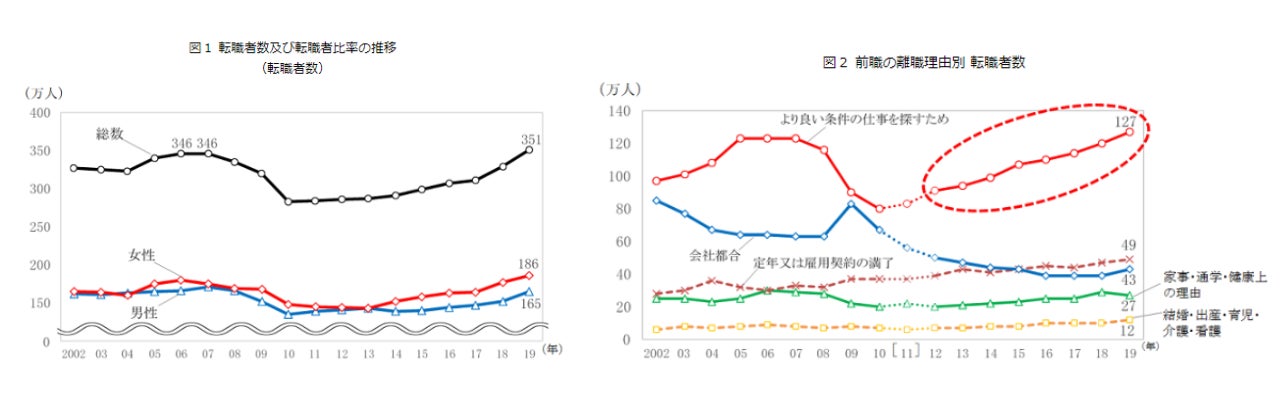 ちなみに、総務省が発表した「増加傾向が続く転職者の状況」、厚生労働省が発表した「雇用情勢の状況等」によると、2019年の転職者数は過去最多を記録しました。また転職理由をみると、「より良い条件の仕事を探すため」と回答する人がリーマンショック期の2010年以降増加傾向で推移しており、2019年で過去最多の退職理由となりました。