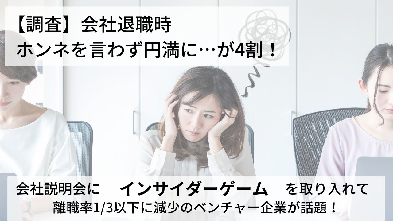 【調査】会社退職時、ホンネを言わず円満に…が4割!退職理由1位「職場の人間関係」を解決し、離職率が1/3以下に減少 施策は“インサイダーゲーム”会社説明会!