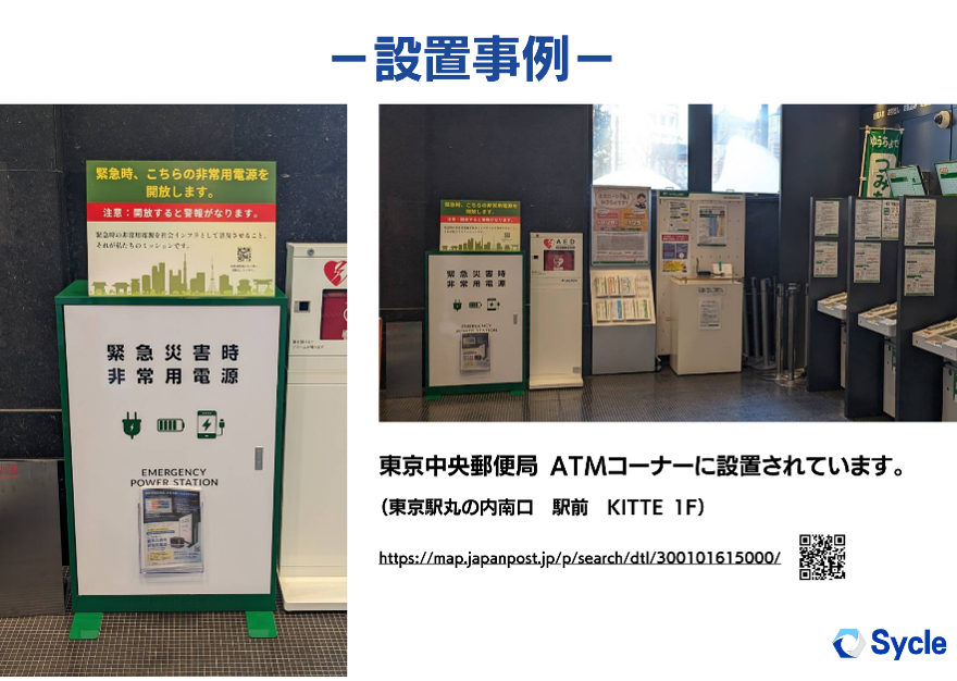 2024年1月より、東京駅前KITTE丸の内東京中央郵便局に弊社の「SYCLE緊急災害時非常用電源BOX」を設置しました。