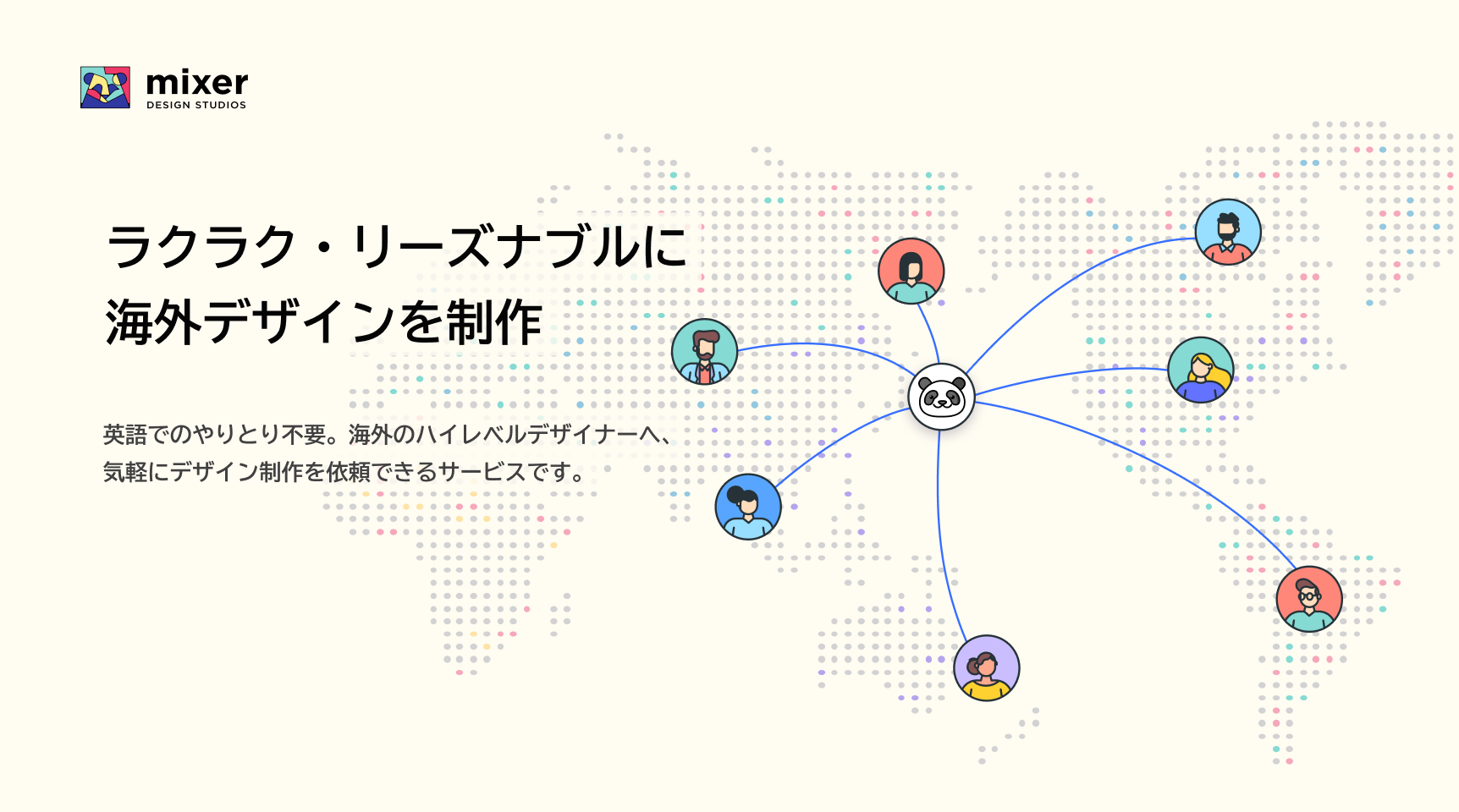 このような状況を打開するべく、優秀で比較的低価格で稼働できる海外デザイナーを自社サービスで起用していくことで独自の知見とデザイナープールを確立。 中小企業・スタートアップの多くが抱える上記の課題を解決するため、自社の知見を活かして、海外のハイクオリティなデザインを日本の企業に提供するサービスとしてmixerをスタートさせました。