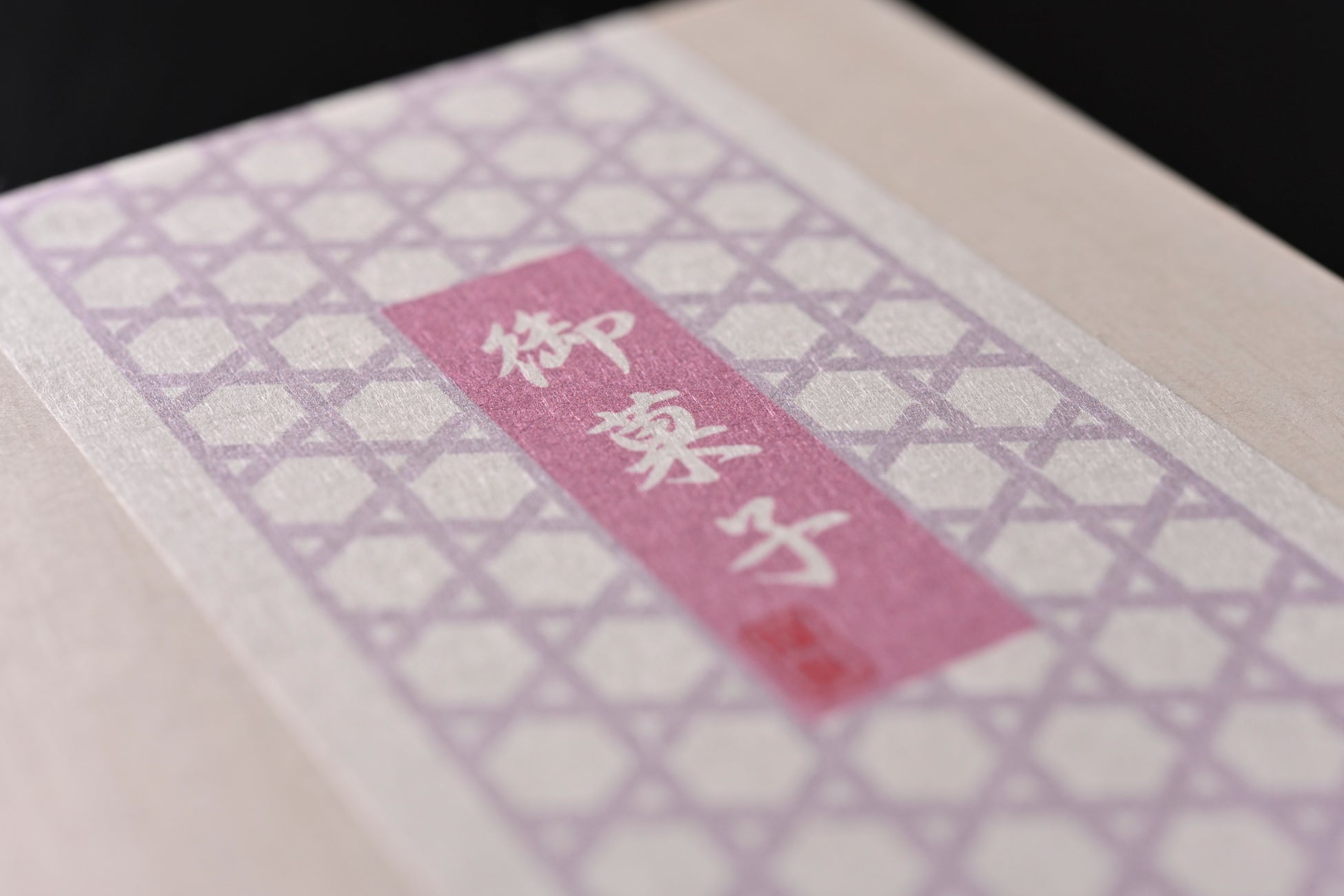 通常の掛け紙は、両端にテープをつけて留めますが、ハレオビは全面がシール。