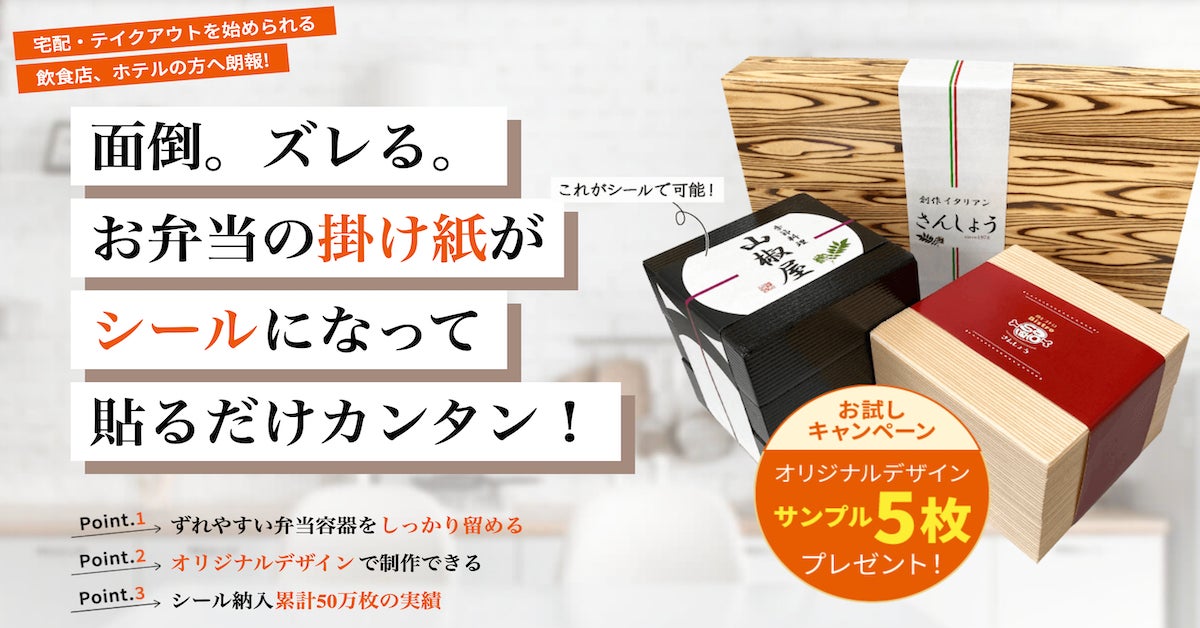 株式会社サンショウ(本社:東京都豊島区、代表取締役:河村禎二)は、全面糊つき掛け紙「ハレオビ」を、2024年10月9日から10日まで東京ビッグサイトで開催される、業界の垣根を超えた商談展示会「FOOD STYLE Japan 2024」に初出展します。「ハレオビ」は、テイクアウトやデリバリーの食品容器に迅速かつ簡単に貼付できる新しいタイプの掛け紙で、便利さと高級感を兼ね備えた高付加価値商品です。