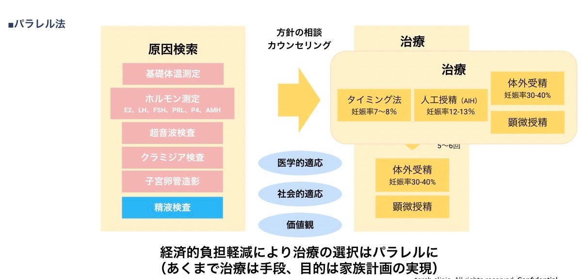 トーチクリニックでは、治療方針を決める際に患者さんに対し、身体の状態や妊娠率といった医学的な適応と、仕事や生活スタイル、子供を望んでからの期間など社会的な適応、そして治療や欲しい子供の人数、挙児に対する価値観などについてカウンセリングを行っています。その上で、患者さんが理想とするライフプランを実現するために、いつ、何が必要かをしっかりと示すことが、不妊治療において非常に大事であると考えています。