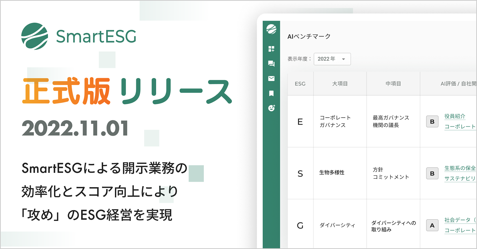 SmartESGは、社内のESG情報を一元化し、ESG活動の分析と改善を可能にするクラウドサービスです。東証の市場再編やコーポレートガバナンス・コードの改訂に伴い、企業が主要なステークホルダーにESG情報を開示し、経済的・社会的価値を統合・実証するという流れは一層加速しています。この流れを受けてシェルパでは2022年5月から「SmartESG β版」の提供を開始し、東証プライム市場を中心とする利用企業様の多様なご意見とご要望を基に機能を拡充を進め、正式版の提供開始に至りました。