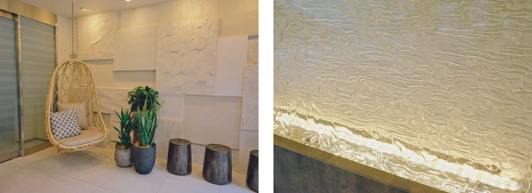 エントランスにはインスタスポットの他に、パネル内部で水が流れ落ちるアクアウォーターパネル(滝)を配し、視覚に響く空間です。エントランスからメイン通路にわたって、土壁・左官壁を用いて雨風で変化をもたらす地層をイメージし、凹凸のある地球の大地の質感を表現しています。
