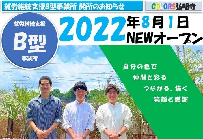 2022年8月1日、障害者向け支援施設の就労継続支援B型事業所、COLORS弘明寺(からーずぐみょうじ)が横浜市の南区に新規開所する。