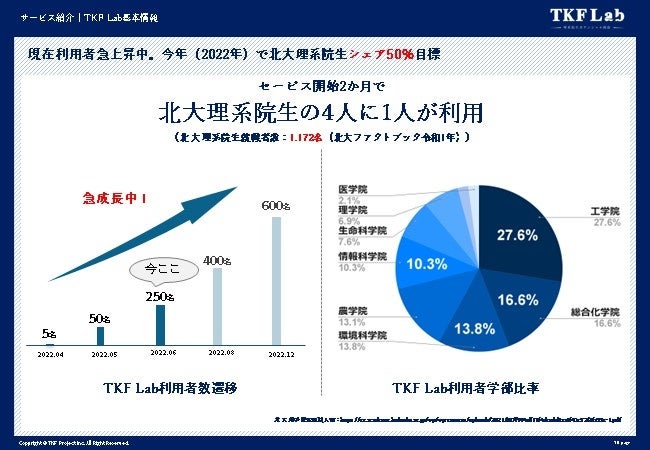 北大発スタートアップ企業認定:株式会社TKF Projectは、新サービス、北大理系学生向けサービス『TKF Lab』をリリースしました。今年中に、北大理系学生50%シェア目標。