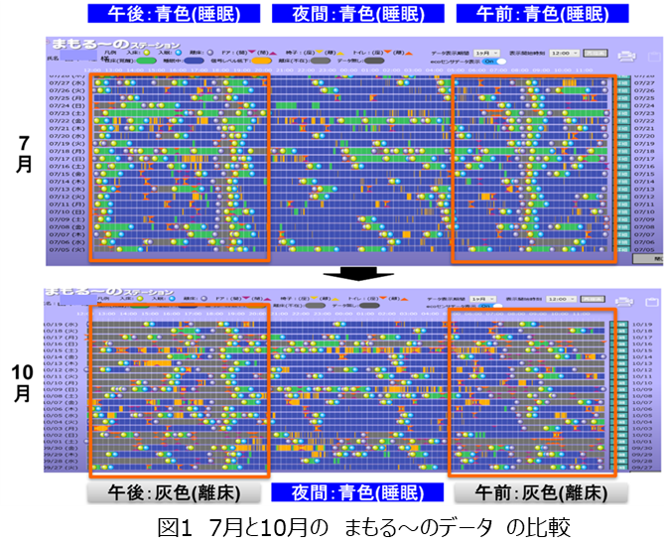 図1の7月赤枠内(午前、午後)は全体的に青色(睡眠)と緑色(ベッド上で覚醒)で一日中ベッド上で過ごしていた。