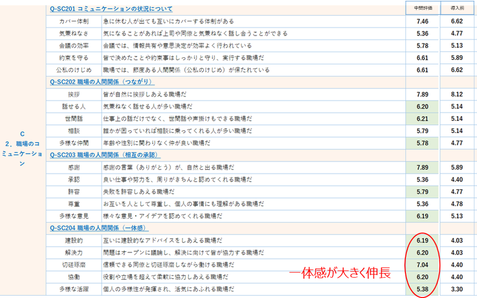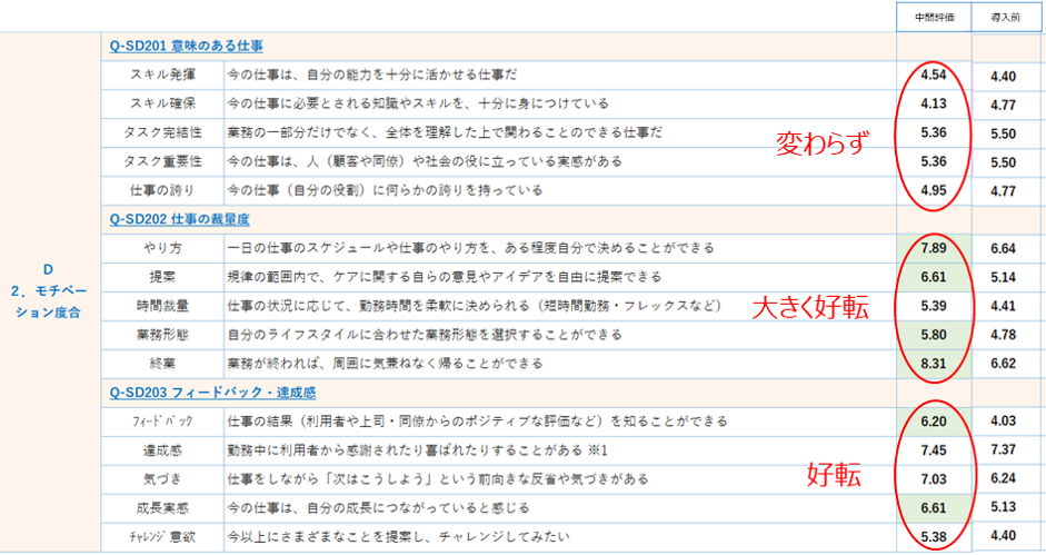「仕事の裁量度」「フィードバック・達成感」でスコアが大幅に改善した。