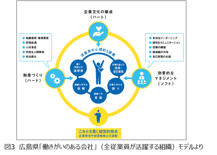 個のケアでなくチームケアができる組織へ成長し始めた。特に図2にある「②コミュニケーション改善」を大きく認めている。これは図3にある働きがいにつながると考えられている「従業員の心理的5要素」が良い方向へ変化していると考えられる。