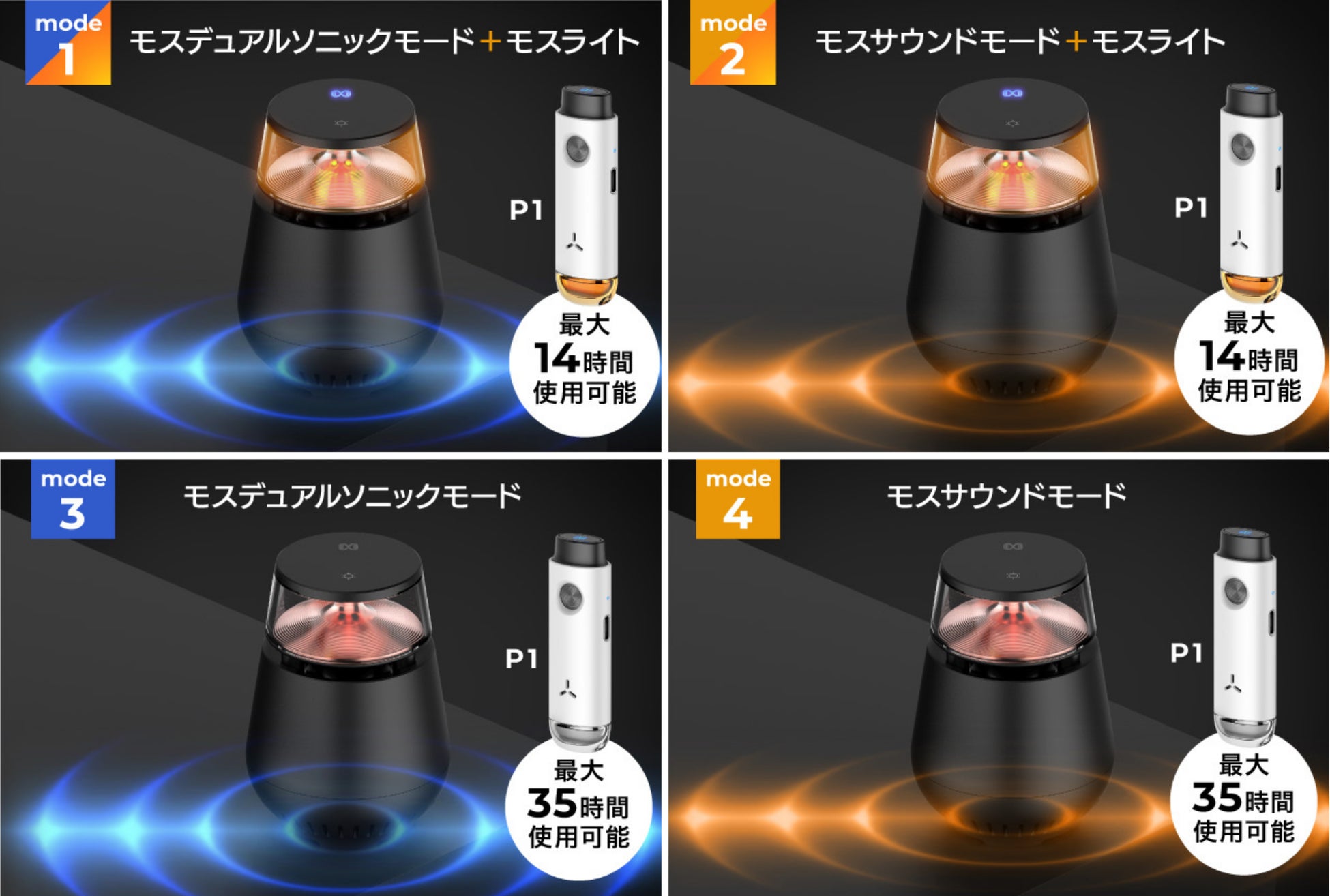 ④モスサウンドモードは②からライトを消したモードです。虫が嫌がる可聴音が見えない盾として働きます。