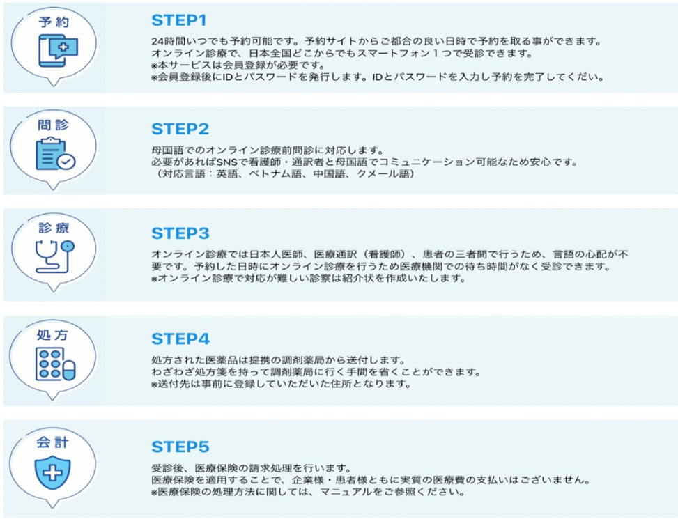 TAKITOでは一般診療をはじめ、メンタル面での診療や健康管理を特定技能外国人や技能実習生に提供するために、外国人診療を熟知している日本人医師と専門知識を持った通訳者(現地看護師)と患者様の三者間をオンラインでつなぎ診察を行うサービスを提供してまいりました。病院に行く時間が省け、付き添い不要で、母国語で日本人医師の診察から処方までスマホ1つでどこからでも利用が可能となっております。また、本サービスは企業様、受け入れ支援機関様に対して、受診された患者様からの情報をもとに、産業医的観点から健康管理や労働環境に関するアドバイスも行っております。