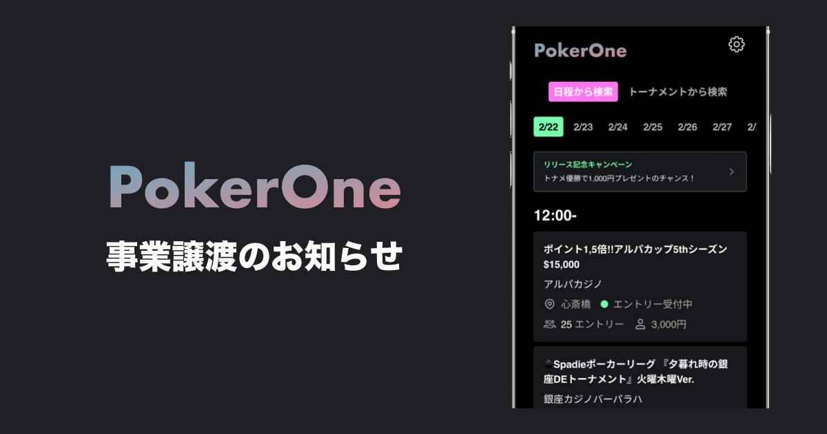 ONE株式会社、トナメ検索アプリ「PokerOne」を事業譲渡したことを発表。