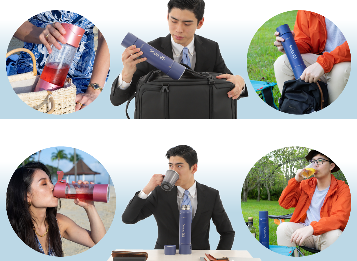 スポーツやエクササイズの後、キャンプやピクニックの場所等、どこでも手軽にソーダを楽しみたいと常日頃感じていました。今までにない、簡単操作・持ち運び可能なソーダボトルである当商品と出合い、製造工場との調整やガスカートリッジの供給元リサーチ、専用キャリ-ケースの調達等を経て、Soda25が完成いたしました。