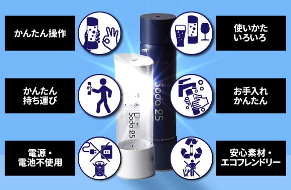 •ハンディサイズと軽量ボディを実現し、オフィスで海で山で。どこでもソーダを手軽に楽しんでいただけます。