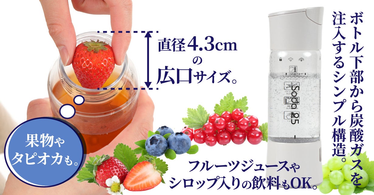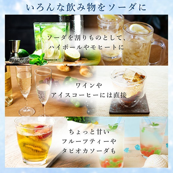 - 水、ワイン、お茶、コーヒー、フルーツジュースは勿論、果実やタピオカ入りの飲料もソーダに。