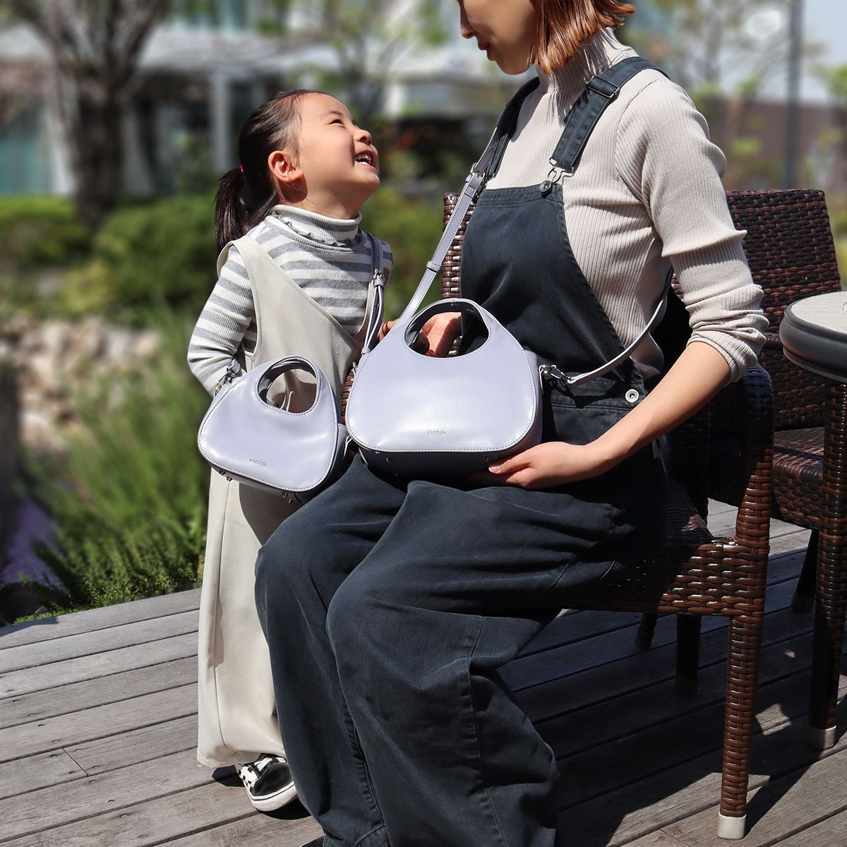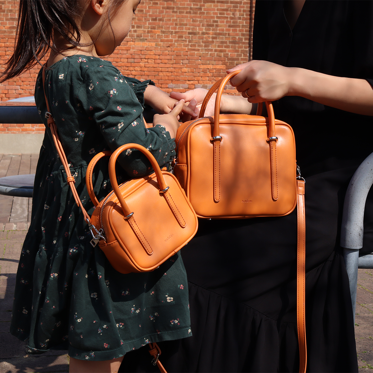 商品が生まれたきっかけは、私(代表:稲田正明)の娘たちへのプレゼントでした。これまで洋服や靴などでお揃いのプレゼントを頂いたことがありましたが、子どもの成長とは驚くほど早いもので、せっかく頂いたものがすぐにサイズが合わなくなり、勿体無いと感じていました。そこで気付いたことがバッグであれば体が成長しても数年バランスが変わらずに持てるということでした。私には間が3つ離れた二人の娘がいますがマイクロバッグは3歳ぐらいの身長差では全く違和感がなく合わせることが可能です。子どもはママが持っているものがとにかく大好きです。ママと全く同じ本格バッグがママと同じサイズバランスで持てる!と今までのプレゼントで一番喜んでもらえました!
