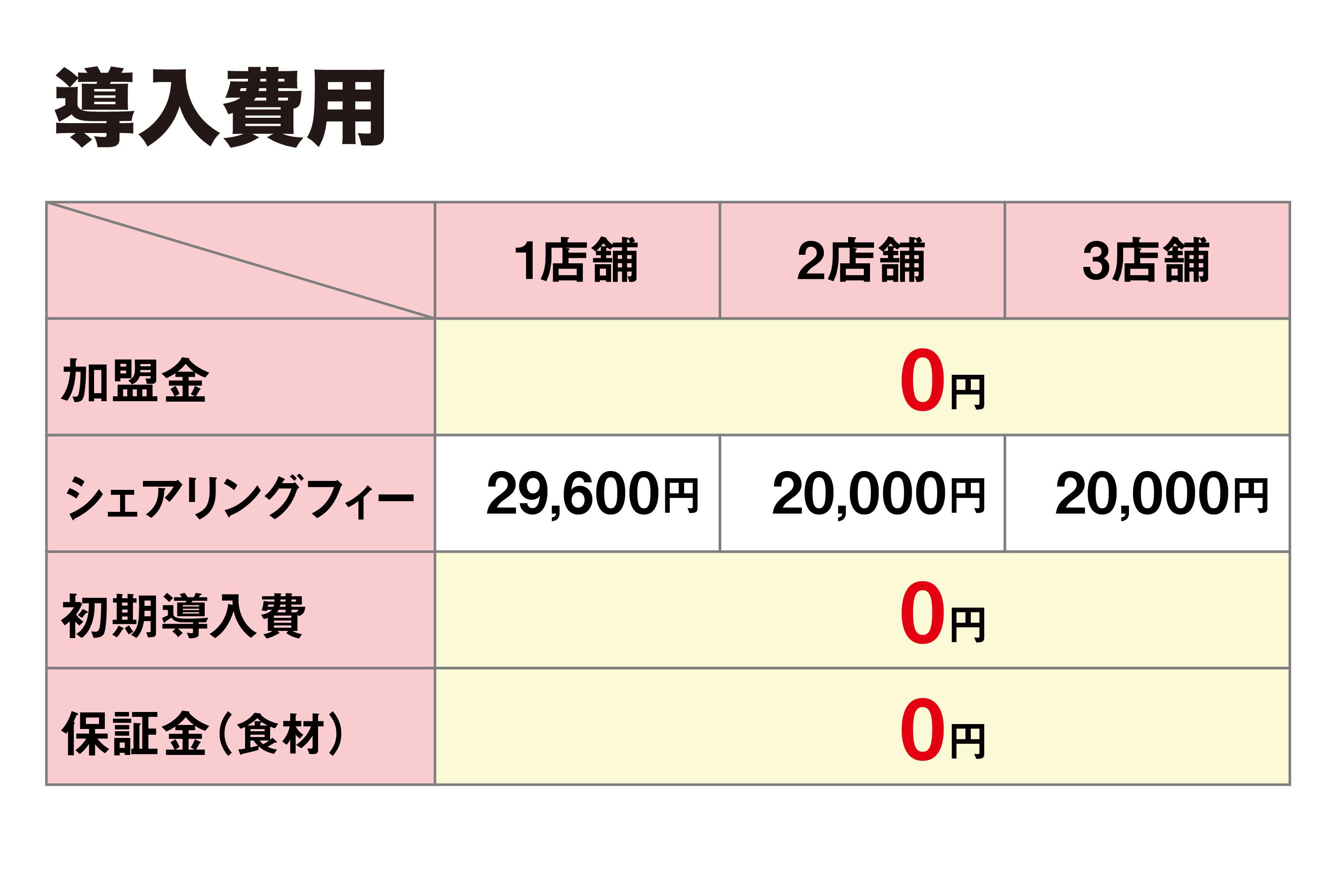 初期費用としての加盟金・保証金は0円、月額費用は、仕入原価(指定食材等当社からの仕入)+デリバリーPF手数料+シェアリングフィー(1店舗目は44,000円)など。シェアリングフィーは2店舗目以降わずか一律22,000円、加盟金も2店舗目以降も0円となっており、あなたの店舗が売上を上げるほどお得になるプランです。