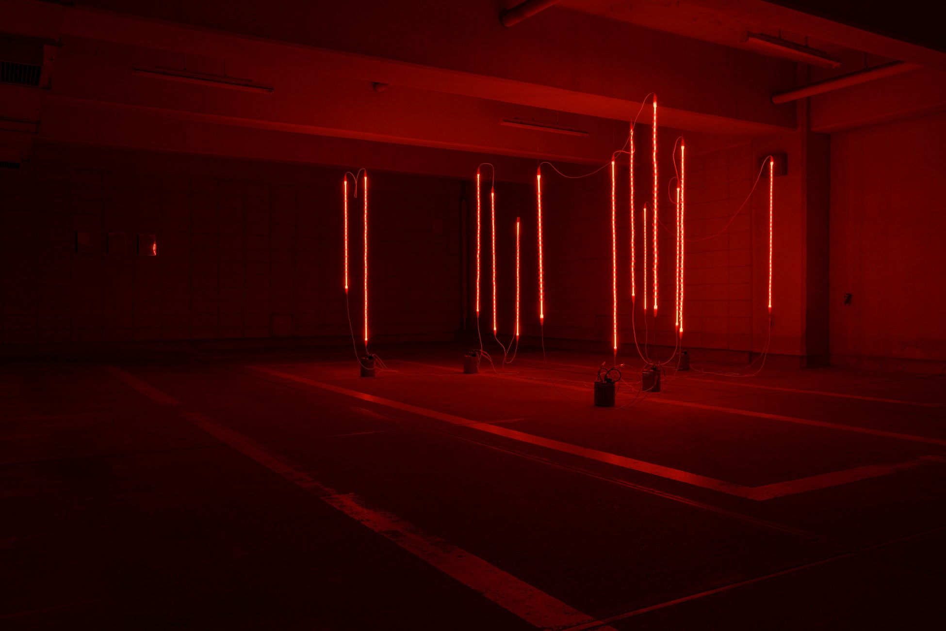 1階ブラックチェンバーでは、これまで大御所作家の展示が中心でしたが、今回は中堅作家によるユニット「アンチテイル」(国谷隆志、はしもとともこ/+1art )が登場。会場中央にネオン管で矩形空間を構築し、その内部に立体作品を配置するインスタレーション《視線と夢》を発表します。鑑賞者は矩形の周囲を巡りながら作品と向き合う構成です。