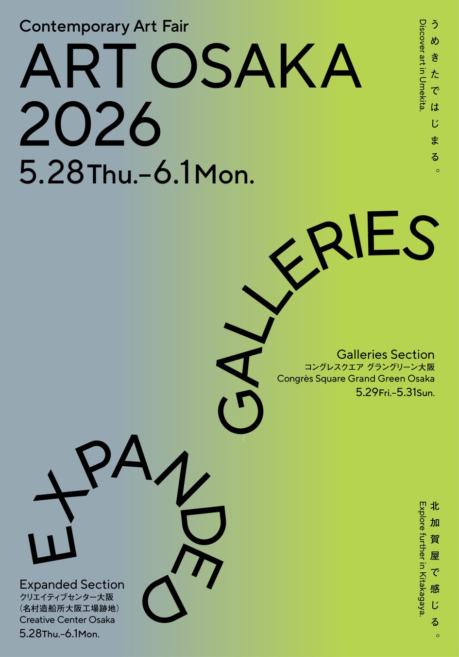 現代美術のアートフェア「ART OSAKA 2026」は、2026年5月29日(金)〜31日(日)にコングレスクエア グラングリーン大阪(うめきた)で開催するGalleriesセクション(のべ52ギャラリー参加)と、5月28日(木)〜6月1日(月)にクリエイティブセンター大阪(名村造船所大阪工場跡地 / 北加賀屋)で開催するExpandedセクション(13組参加)の二拠点で実施します。