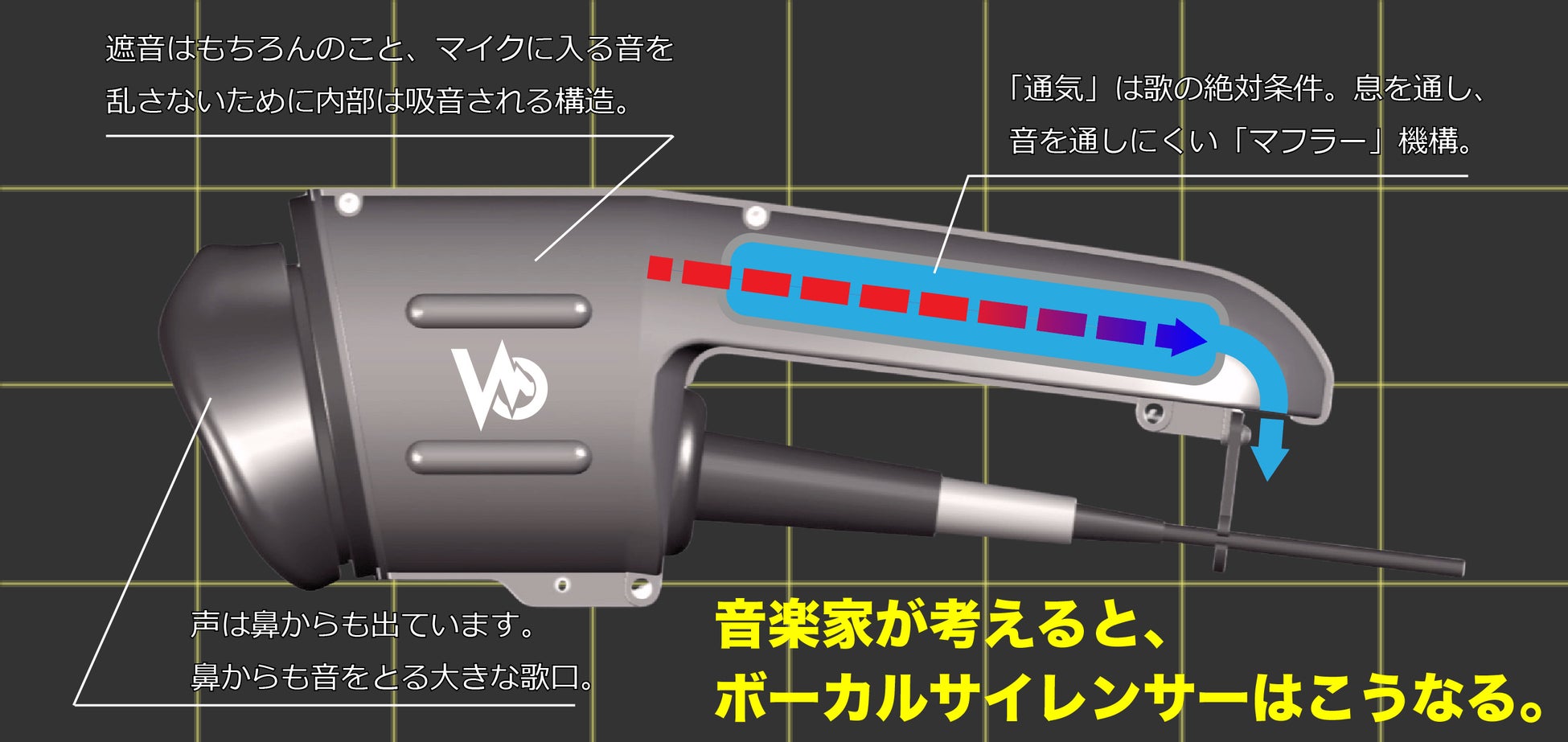 市販の⼿持ち型マイク(別売り)にセットして使⽤し、しっかりと⼝につけた状態でも、内蔵されたマフラーで⾳漏れを軽減しながら呼吸ができます。また、⼤きな歌⼝で、⾳楽的な歌声には必須の「⿐からの⾳」もマイクで集⾳されます。内部の遮⾳・吸⾳に優れており、防⾳効果は-20dB 以上(⾳圧約 10 分 1)を実現しました。遮⾳には重量が伴うものですが、Voicease は 600g(マイク含め約 1Kg)と、⽚⼿で持てる重さです。(特許・意匠申請中)
