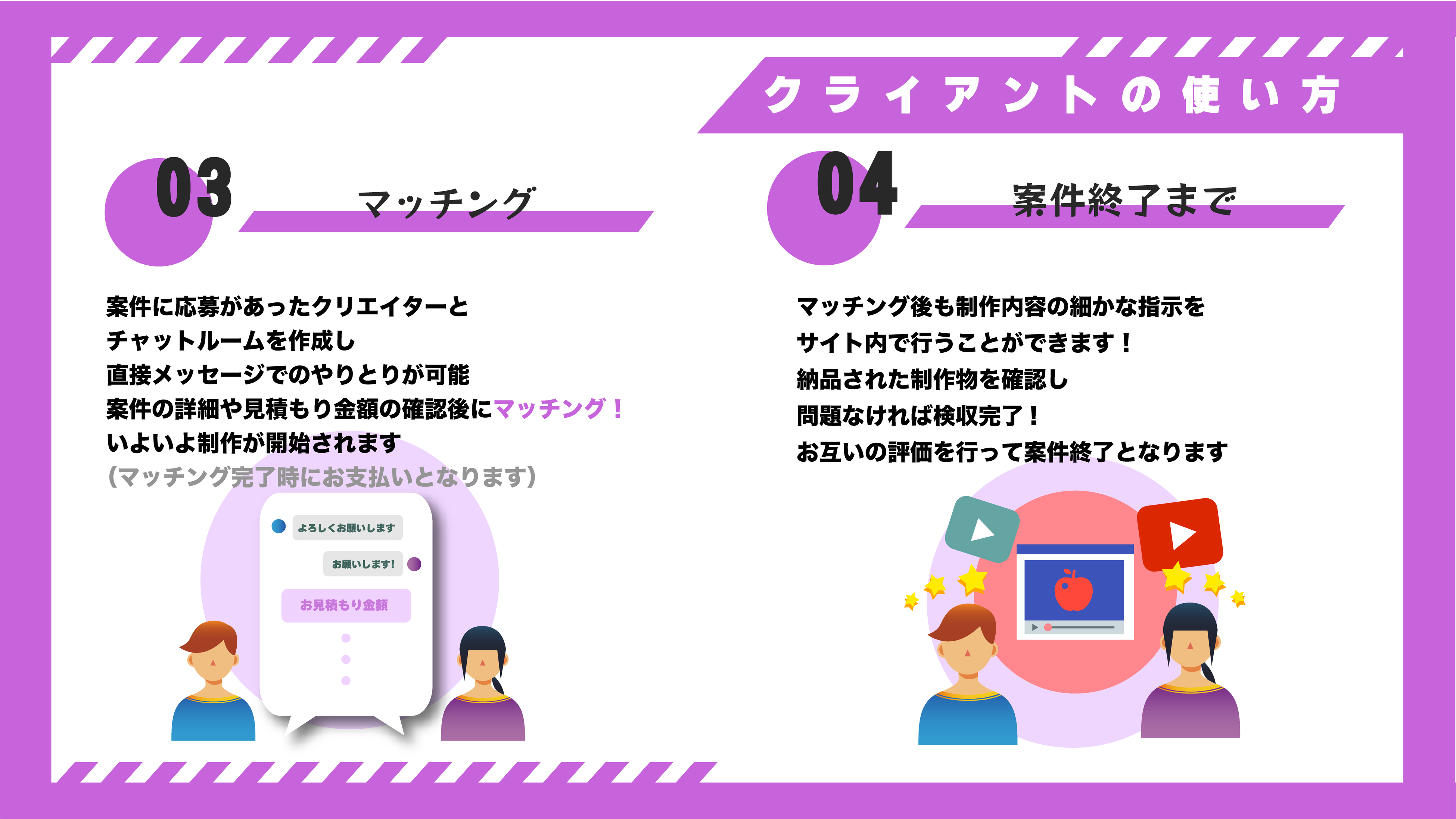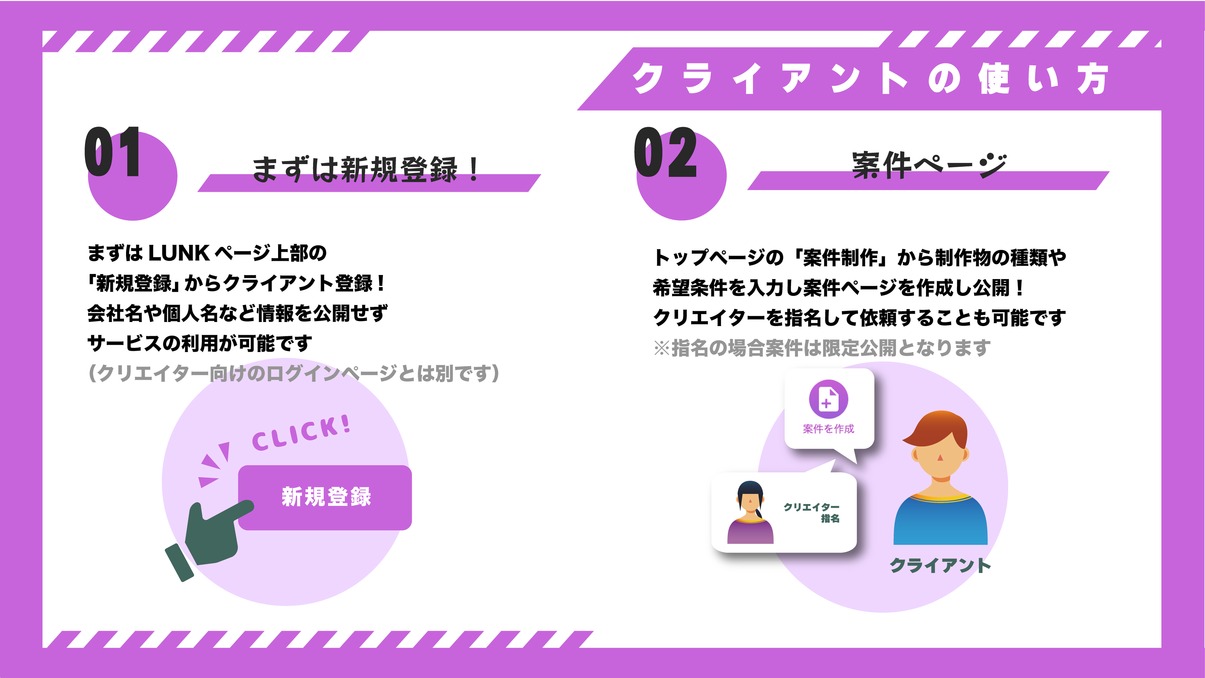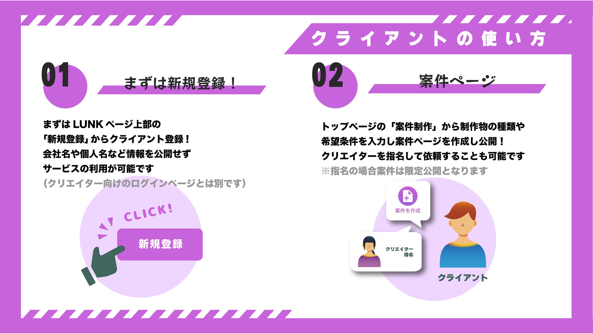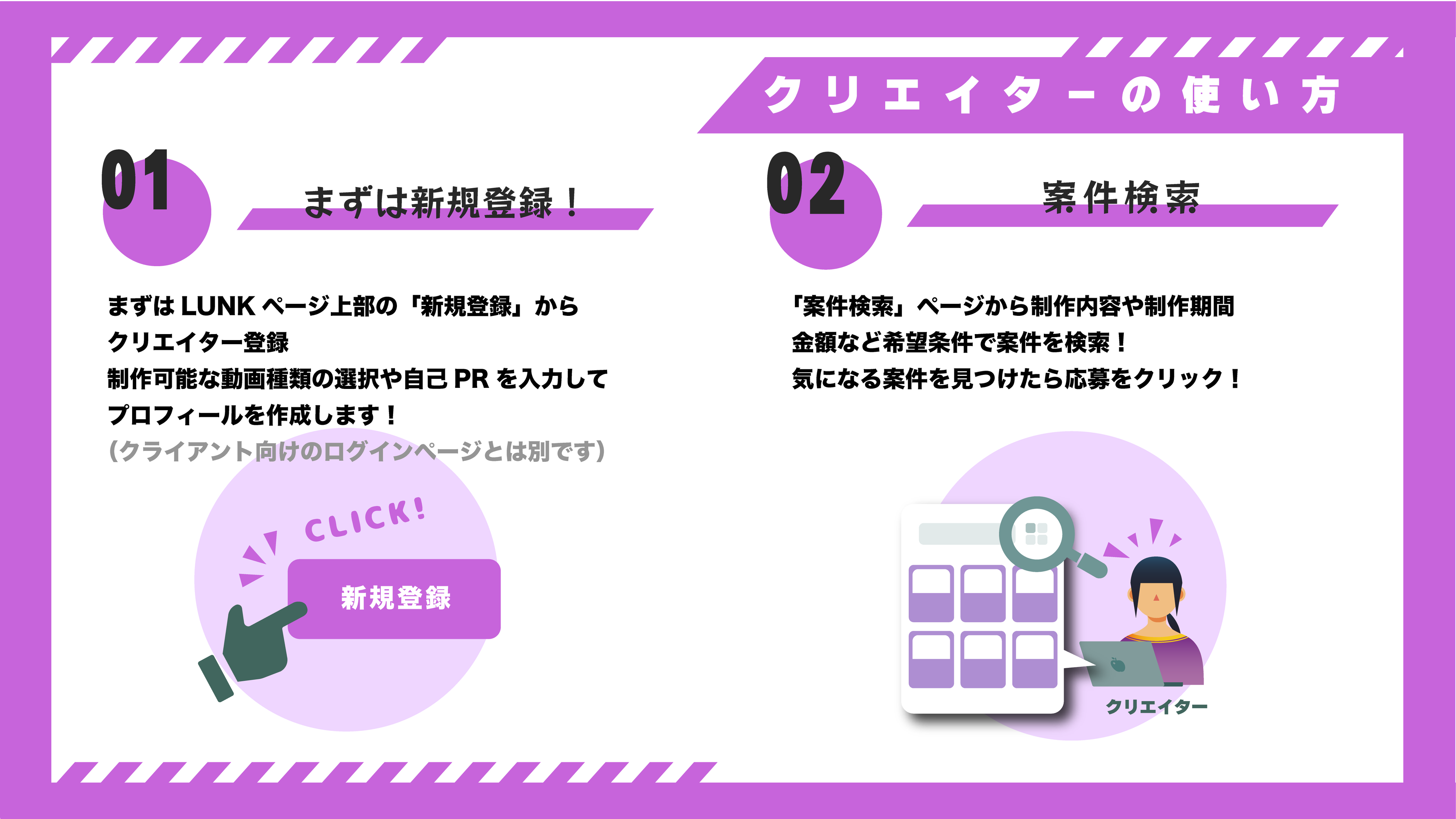 クリエイティブな分野で様々なマッチングサービスがありますが、「LUNK」では特に”動画制作”だけを目的としたマッチングを行います。