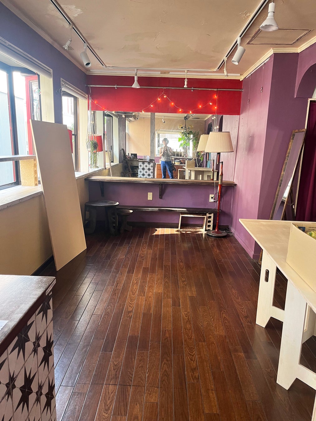 私がこの場所に初めて来たのは2022年の4月でした。PARADISOの前はビンテージのお洋服屋さんでした。わたしのお友達がそのお店の常連でこのお店に連れてきてもらいました。お洋服はもちろん素敵だったのですが、実はその時、わたしはこの物件に一目惚れしていました。紫色のアーチ壁、出窓の多い間取り、赤色の扉、レトロな建物、坂の中腹にあって、パリで入ったあのセレクトショップのようでもあり、ポルトガルで行ったあのお土産屋さんのようでもあり、あの国で行ったあの店のようだ、という記憶が続々と蘇りました。と同時に、昔、自分がやっていたお店の雰囲気や壁の色ともリンクして、この物件の虜になりました。同年の11月に前オーナーがお店を閉めると聞き、閉店セールに行ったところ次の借主がまだ決まっていないと店主から聞きました。不動産をお尋ねしてそのまま不動産へ行き、その場で借りることを決めました。前日までは考えてもいなかったことだけど、このチャンスは逃してはいけないと、物件に逆指名されたとも感じました。