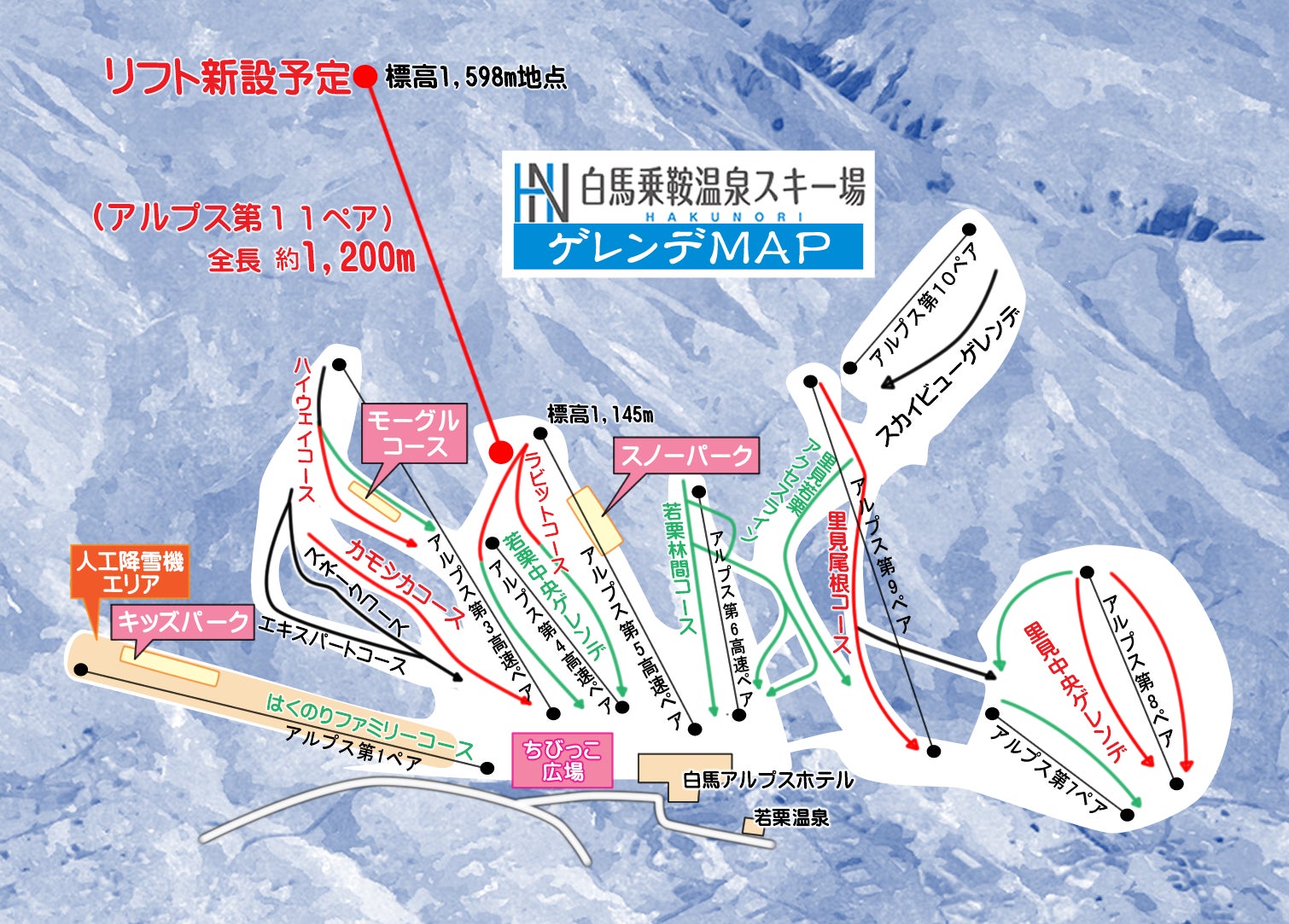 新設されるのは、アルプス第5高速ペアリフト横より乗車し、標高1,598m地点まで乗車する第11ペアリフト。若栗ゲレンデ下部までの標高差は730mとなります。