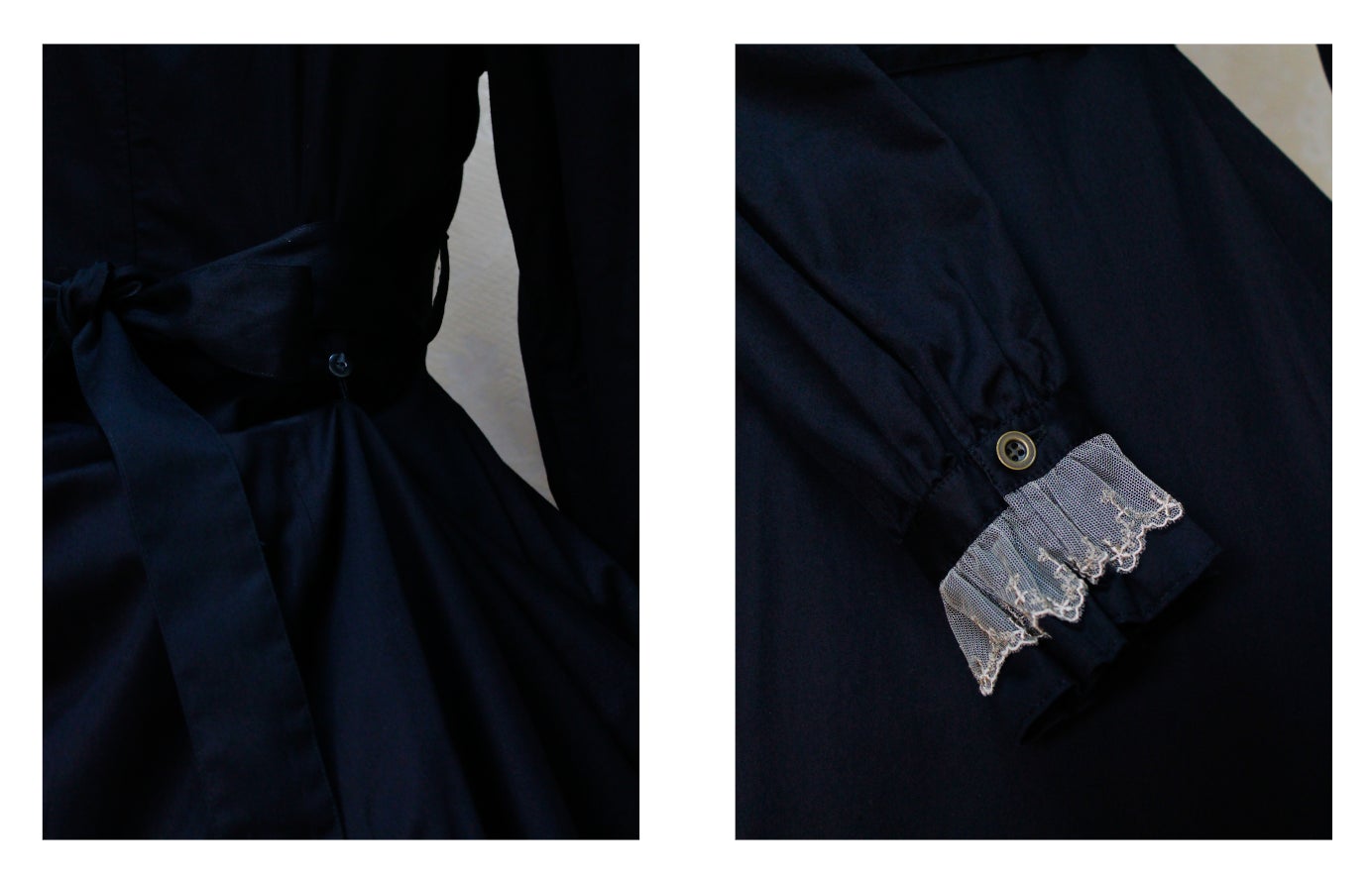 バッスルのボタン部分と袖のレース部分です。細かいディティールにもこだわり美しいシルエットがでるように改良しています。