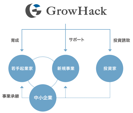 GrowHack株式会社では、こういった若手起業家を輩出するためのビジネススクールや、イベントの開催、メンター事業といった一連の支援を行い、起業後もまた当社の新規事業を作り続けてきたノウハウを活かして伴走型の支援を行っていきます。