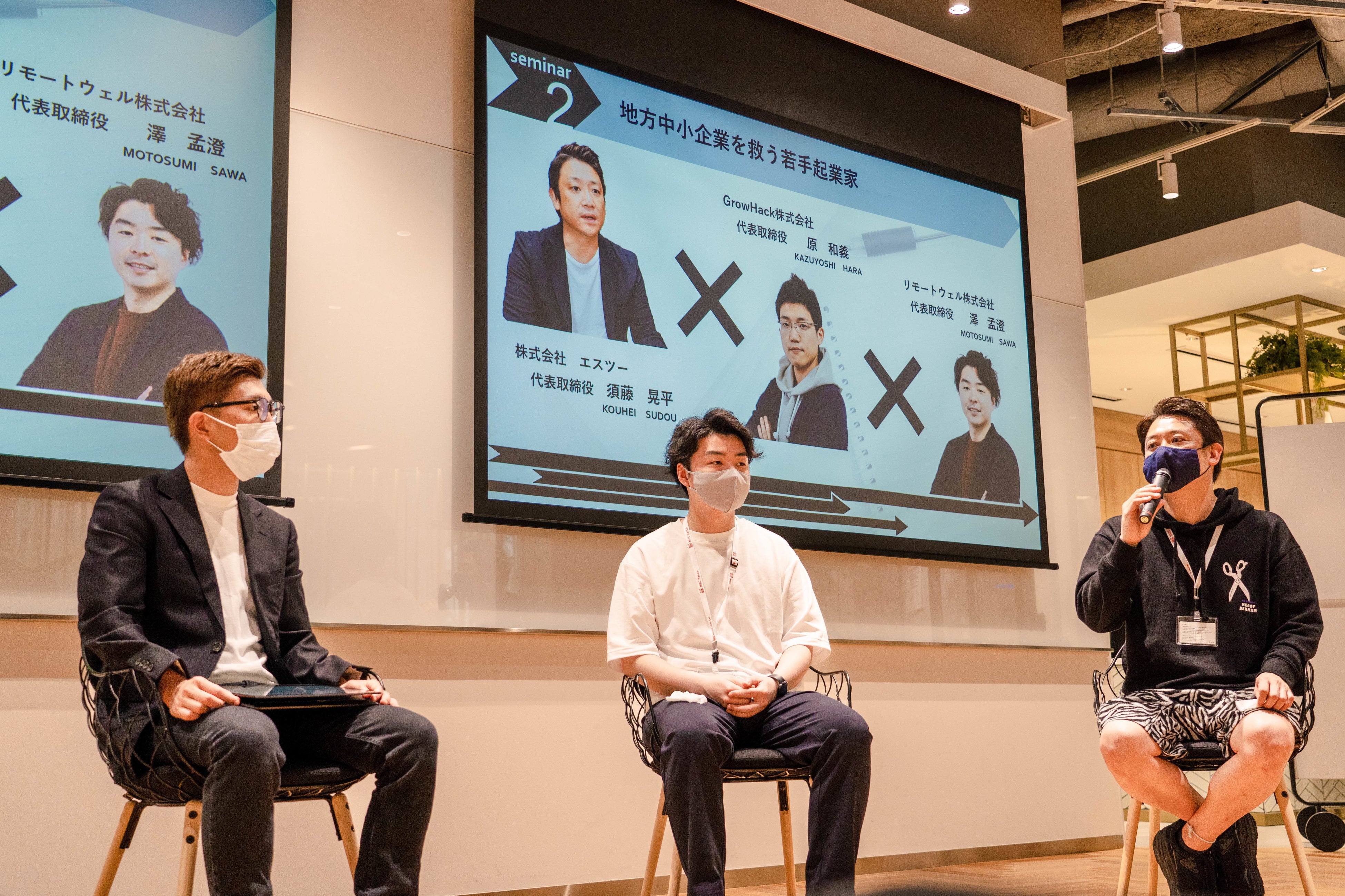 起業に際しての想いや上場を目指す中で考えていること、地方での起業の実情や成功の鍵など、若手起業家である3名の今まさに挑戦中である体験や想いが語られました。若者にも、ベテランの経営者にもポジティブな空気をもたらす対談となりました。
