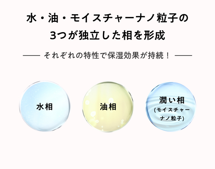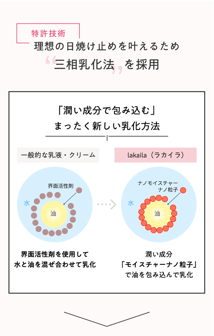 一般的な日焼け止めとは違い、潤い成分の“モイスチャーナノ粒子”で油を包み乳化。