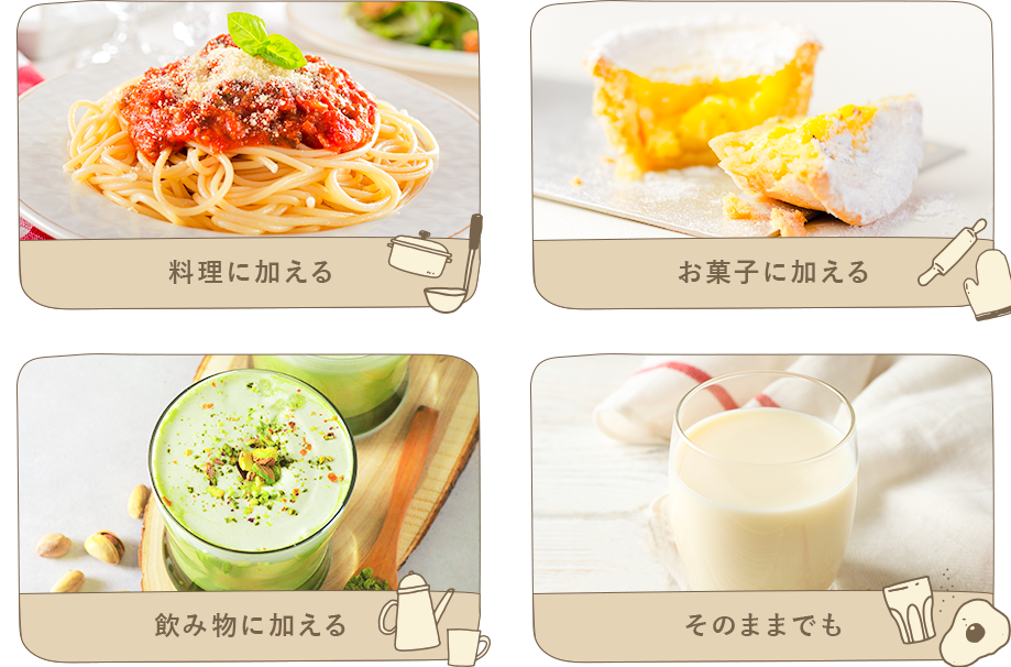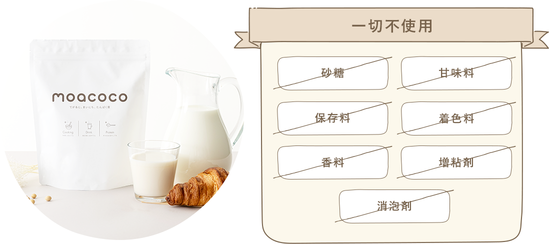 moacocoはカスタムできるプロテインパウダー。料理や菓子に加えたり、飲み物にまぜたり、もちろんそのままでも。使い方は無限大です。熱凝固しづらく、食材の風味を損なわないので、手軽にたんぱく質を摂取することができます。