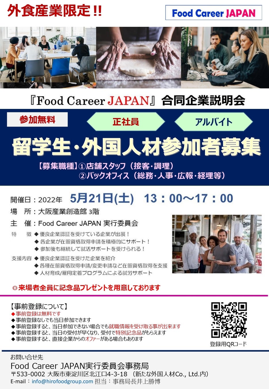 【復活外食産業】2022年5月21日(土)13:00~17:00に『Food Career JAPAN合同企業説明会』を開催。外食産業特化の外国人材向け合同企業説明会(会場:大阪産業創造館 3階)