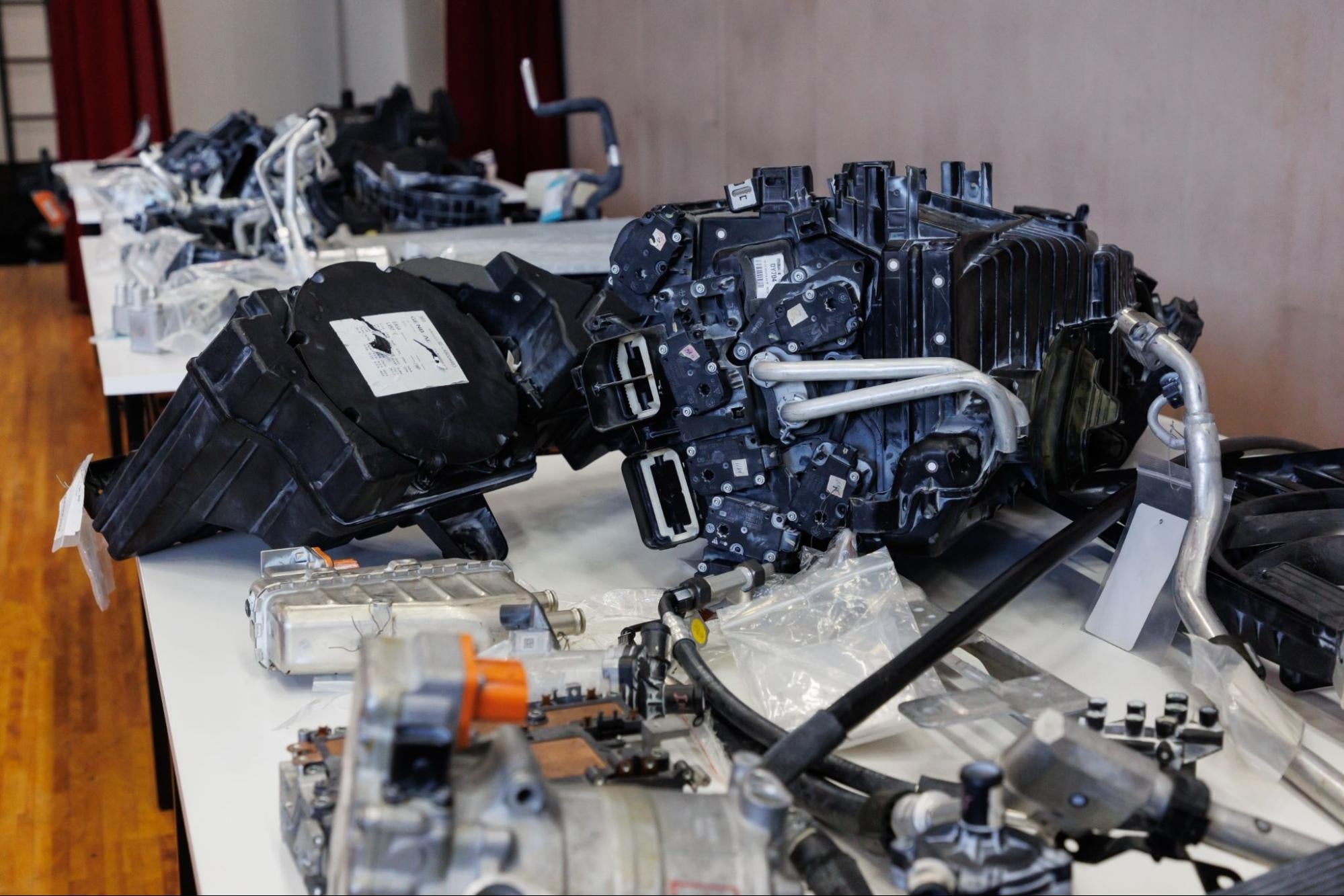 それぞれの車種に搭載されている部品を比較しやすいよう、モーター・インバーターなどのEVパワートレインシステム、バッテリー・空調の温度管理を担うサーマルマネジメントシステム、骨格部品や内外装部材など、部品群ごとにカテゴライズされた展示に変更しています。