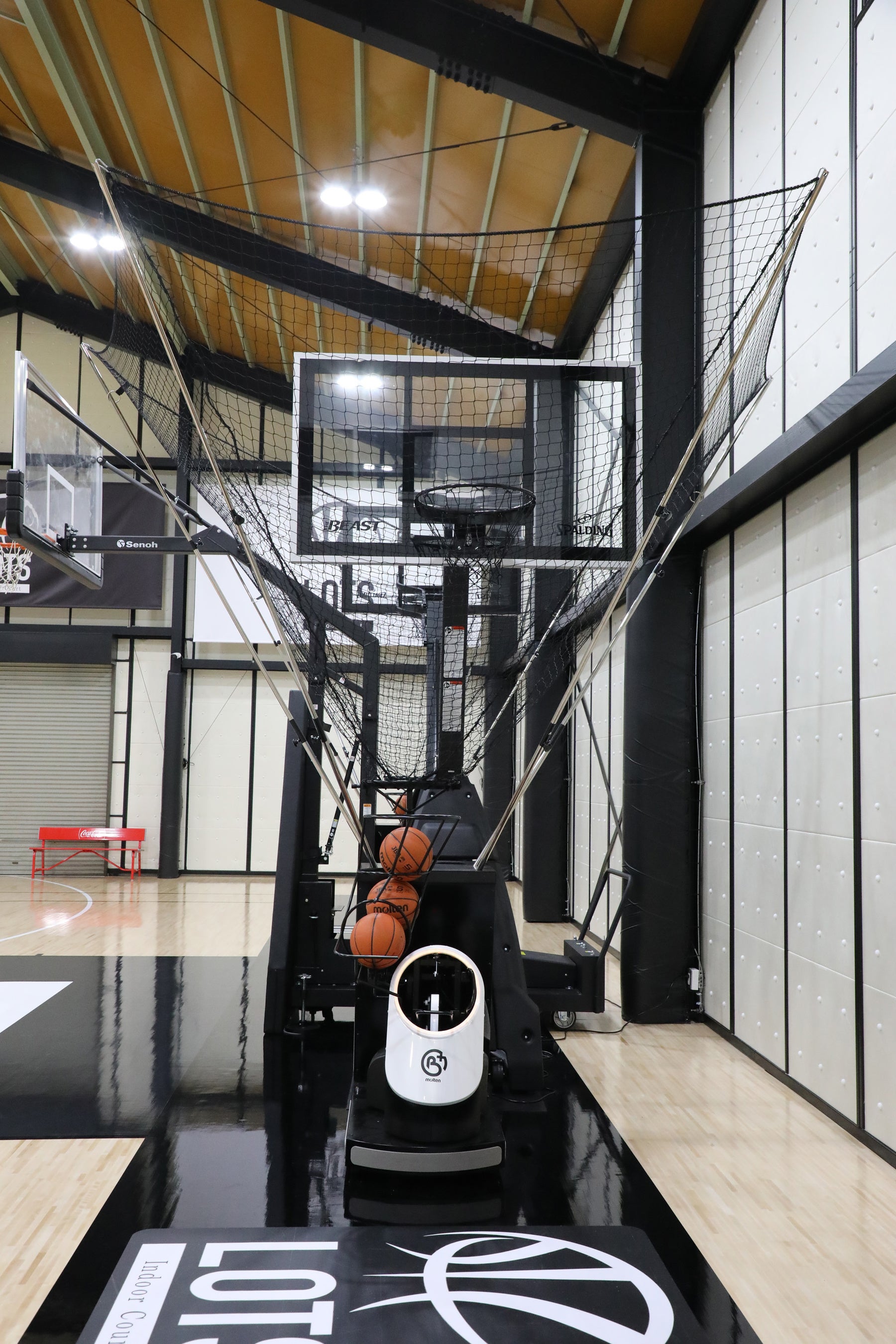 シューティングマシン2台を備えた、スタイリッシュな20m×15mのコート。撮影やダンス、社内イベントなど多目的に利用可能!
