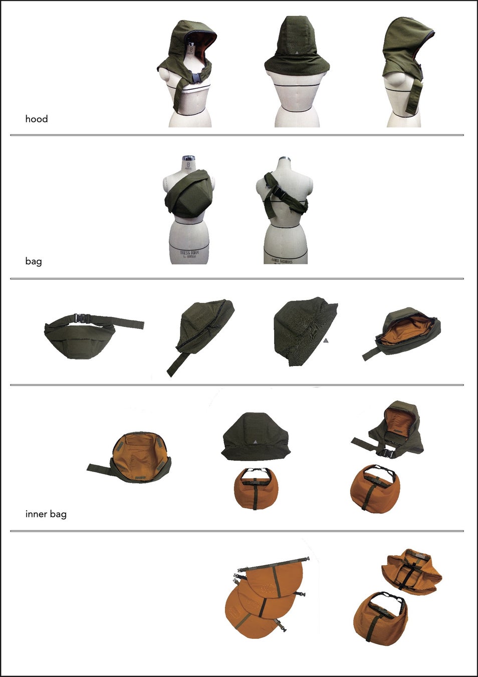 普段はインナーバッグをつけた状態でバッグとして使用可能です。災害時は、持ち物が入ったインナーバッグを取り出して、外側のバッグを頭巾として被ることで、落下物などから頭部を守りながら避難できます。