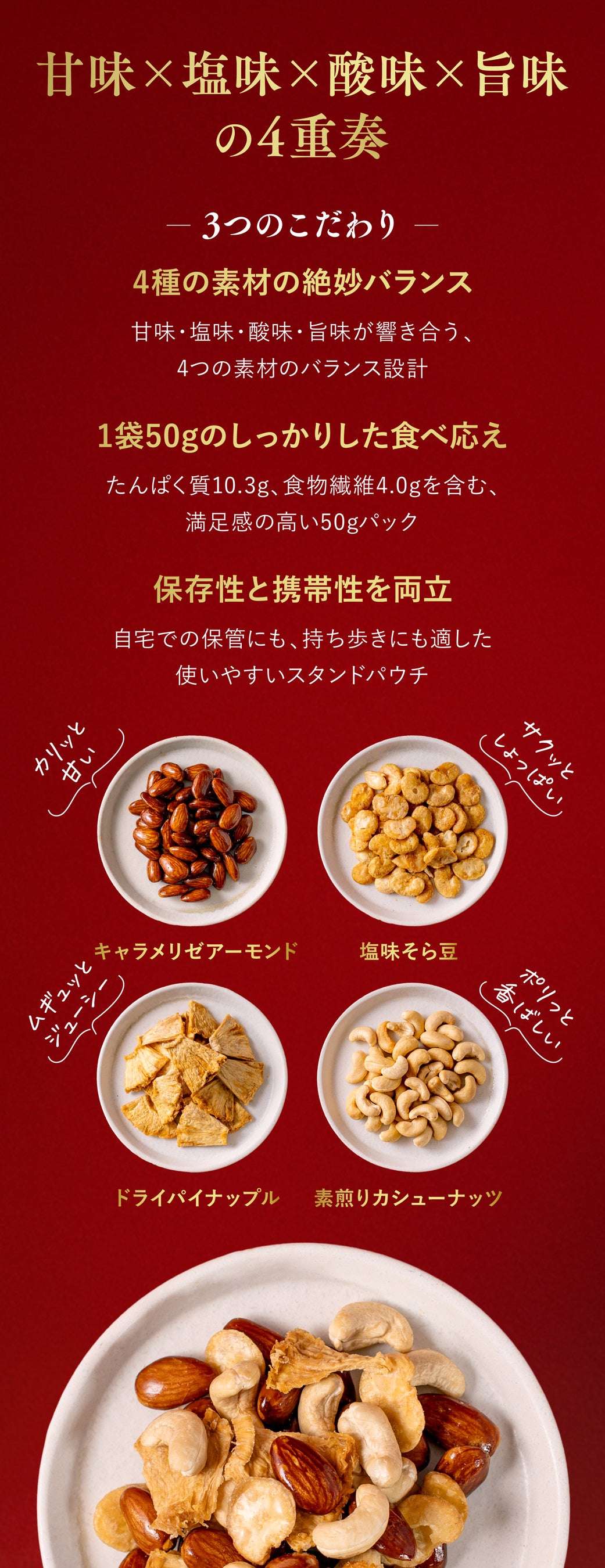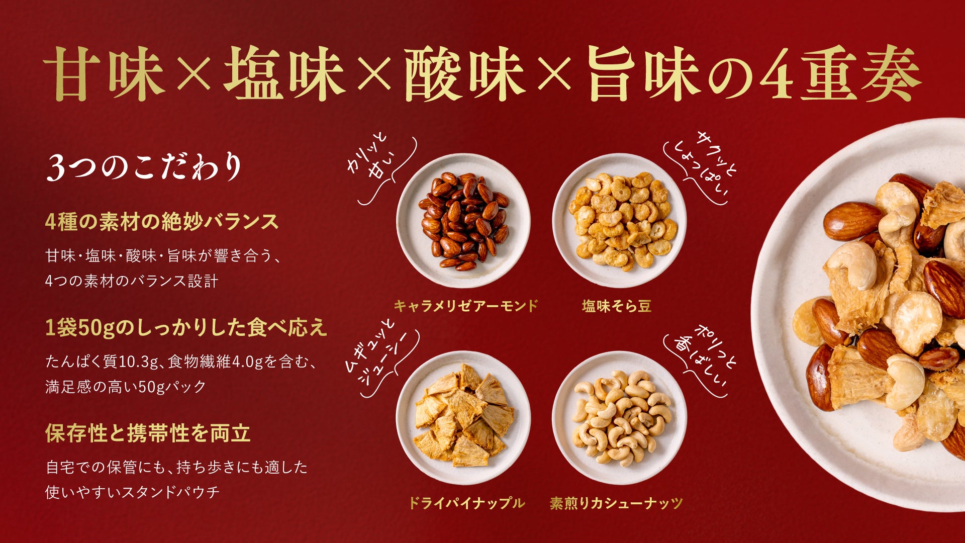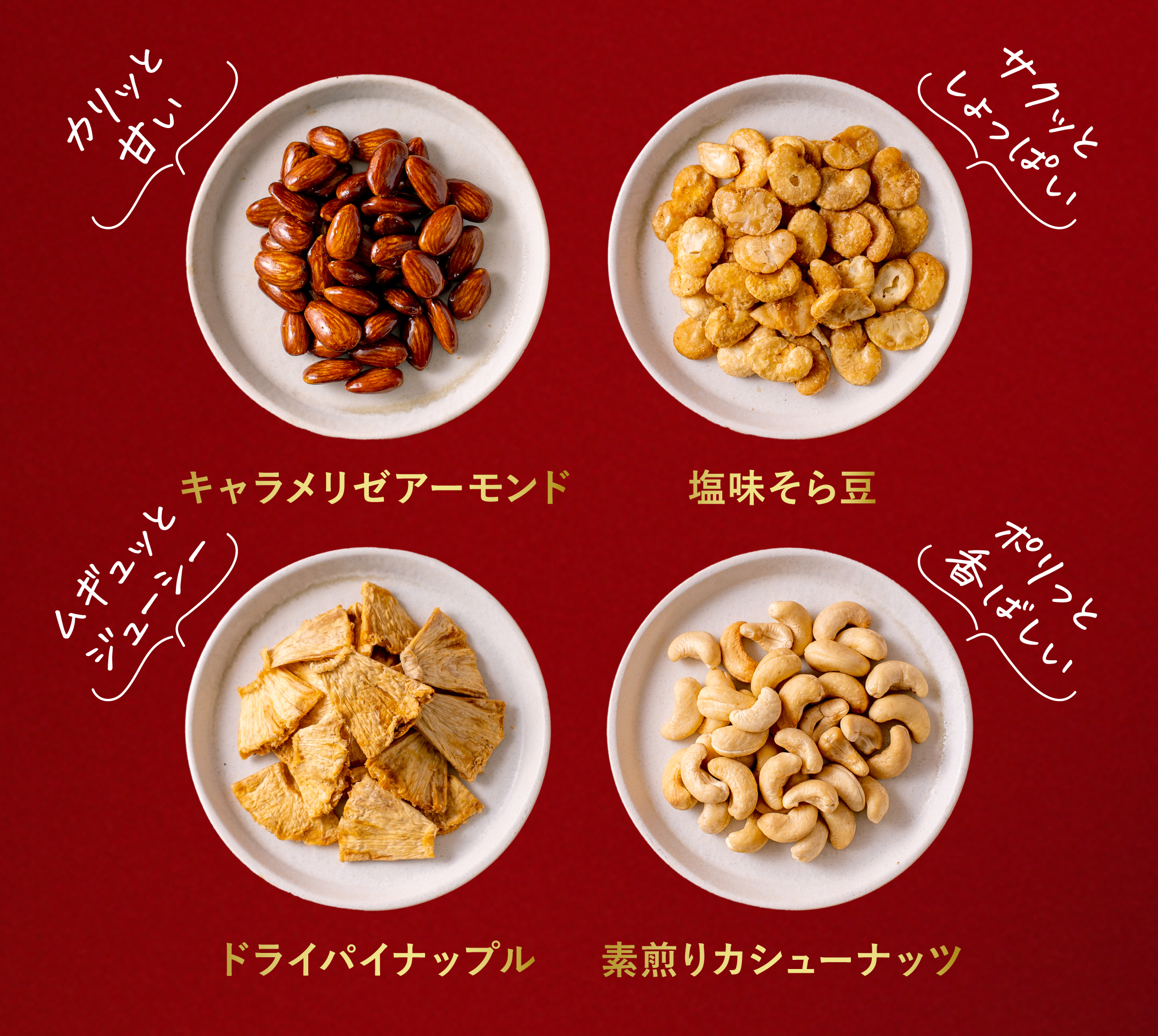 おやつとしての楽しさや満足感があり、なおかつ、体にも良いものを目指し、何度も試作を重ねました。まず軸としたのは、キャラメリゼアーモンドと塩味そら豆です。この2つを中心に甘味・塩味のバランスや相性、保存性を細かく検証し、最適な組み合わせを探りました。その過程で、味わいに奥行きを持たせ、アーモンドとそら豆の良さを引き立てる素材として、ドライパイナップルと素煎りカシューナッツを加えることを決めました。