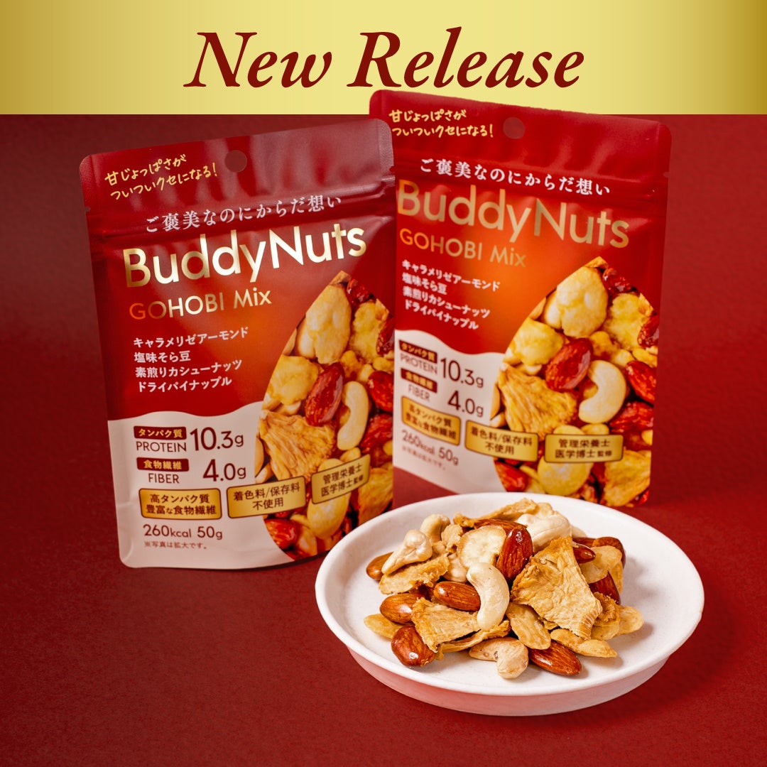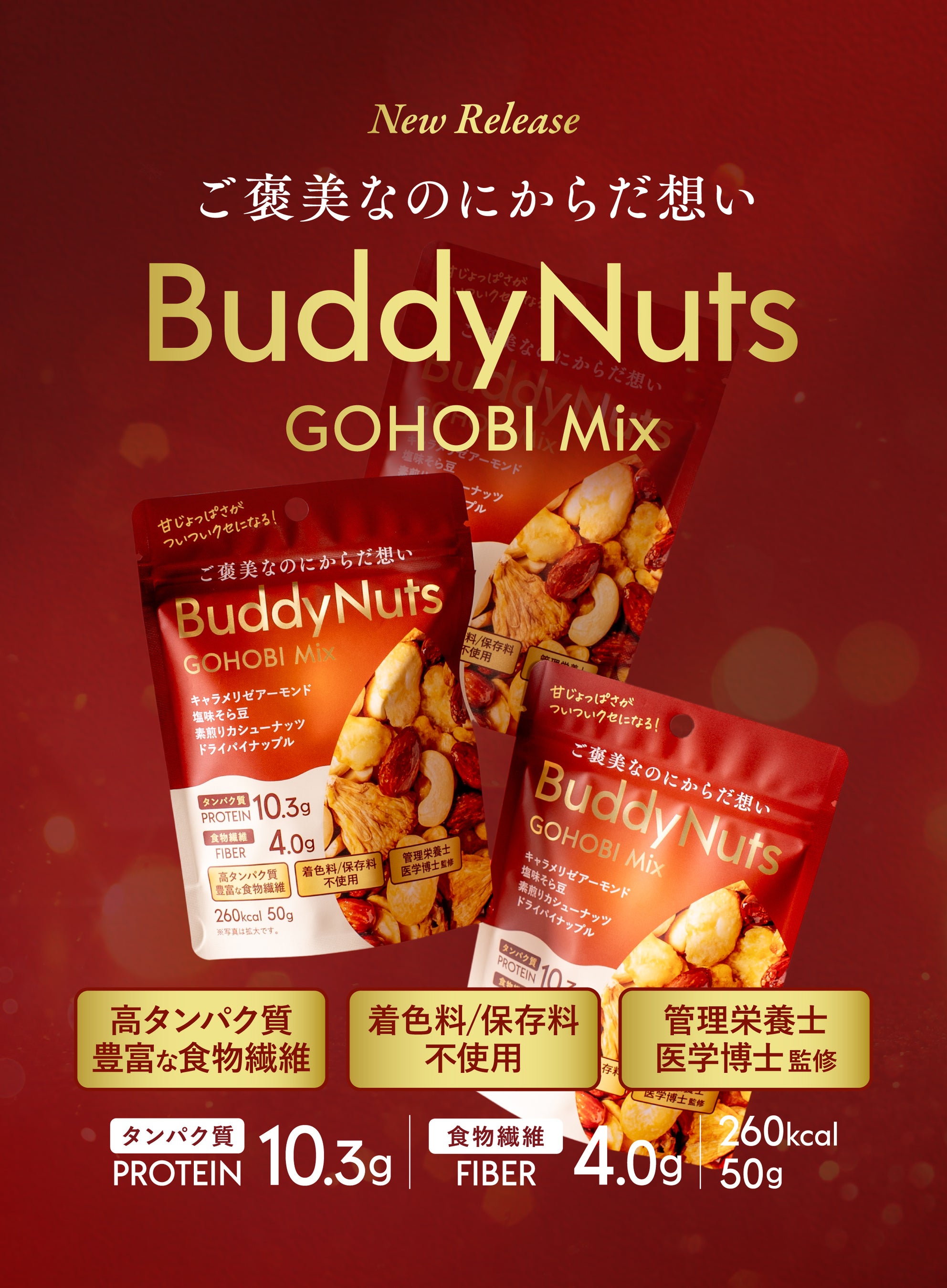 おやつの楽しさとからだ想いのこだわりを両立してお楽しみいただける「BuddyNuts<GOHOBI Mix>」の発売により、お客様に、忙しい毎日に嬉しい“ごほうび”時間を提供してまいります。