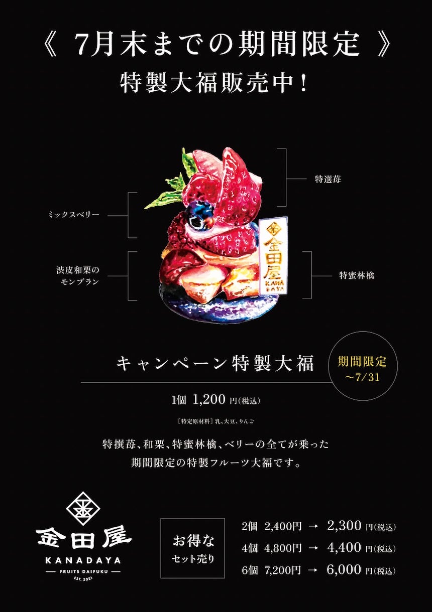 キャンペーンで販売する特製フルーツ大福は、監修の金田章裕やスタッフが考え抜いたボリュームたっぷりのフルーツ大福です。金田屋の人気メニューである特撰苺、和栗のモンブラン、特蜜林檎、ミックスベリーの4種類を1度に味わえる、大変お買い得な商品となっております。