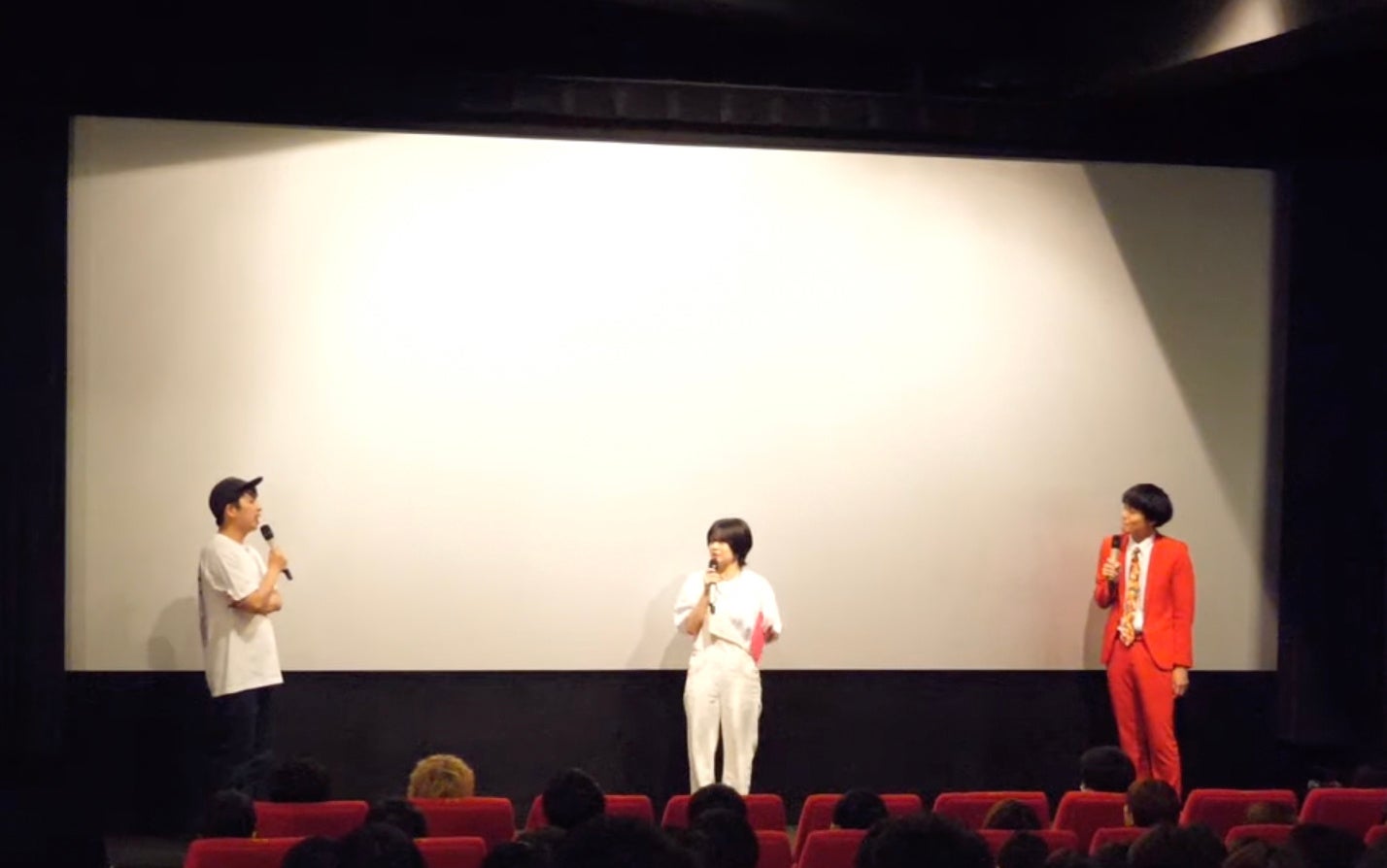 シネマンションは映画好きが好き勝手映画について話し、新旧の気になる映画情報を届けるYouTubeチャンネルで、グラビアタレントのRaMuさん、お笑い芸人のジャガモンド斉藤さん、あんこさんの三人がMCを務めます。会場には、シネマンションのファンが遠くは秋田や京都から駆けつけ、ほぼ満席の200人近くの人が集まりました。上映前にシネマンションの3人が登場し、「シネマンションは映画を観た後に生じる“ああ、誰かと話したい”というモヤモヤっとした気持ちを解消するチャンネルです」とRaMuさんが自己紹介すると、「デトックスチャンネルですね」とあんこさんが間の手を入れ、温かい拍手が会場から上がりました。今回、初めて本作を鑑賞される方も半分くらいいらっしゃり、鑑賞後の感想が楽しみな先行上映となりました。