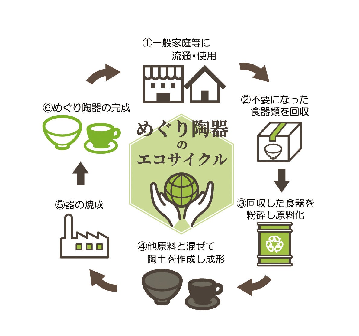 このRe-食器のサイクルはゴミ削減、埋立地拡大の抑制や天然資源である陶土の節約といった環境保全につながります。この流れを絶やさず、さらに普及させるために、二明商店では「Re-食器の普及と、お客様がRe-食器を選ぶ際の選択肢を増やす」ことをテーマに「めぐり陶器」というブランドを立ち上げ、開発をおこなっております。