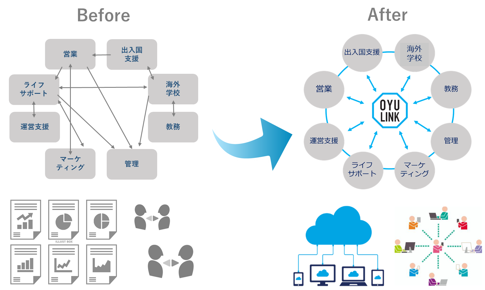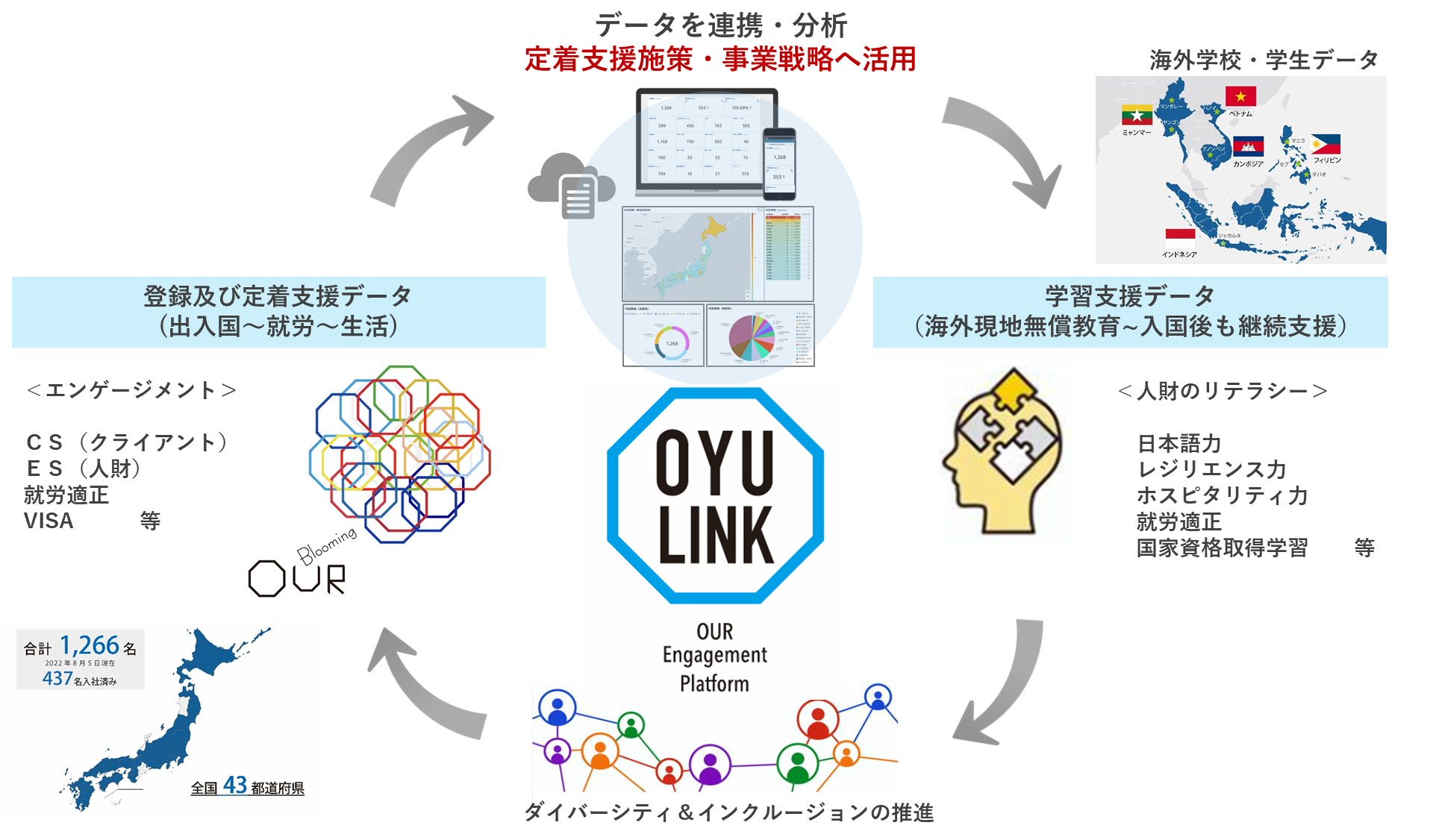 このクラウドプラットフォーム「オユリンク」は、海外にある教育拠点の学生情報及び学習支援データから日本入国後の就労・定着支援におけるワンストップの1stPartyデータを、グローバルかつシームレスに連携・分析し、人財・クライアント及びステークホルダーを有機的につなげていきます。外国人人財が日本社会に適応していくためのベースとなるリテラシーの獲得や、定着に向けたエンゲージメントの計測・分析に使用でき、プライバシー情報の保護とともに、定着支援施策のアップデートや、事業戦略に活かすことができる点が、本ソリューションの大きな特徴となります。
