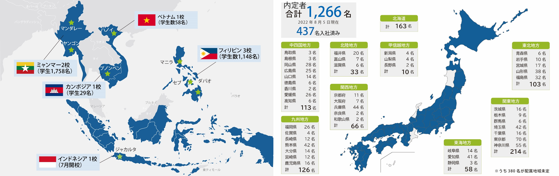 株式会社ONODERA USER RUNは2016年11月に設立。東南アジア5か国(ミャンマー、カンボジア、フィリピン、ベトナム、インドネシア)における人財教育と、特定技能に特化した日本国内への人財紹介事業を展開*2。2022年8月12日現在、学生数は2,983名を数え、これまで特定技能の合格者を1,690名輩出し、1,281名が内定、436名が紹介先での就業を順次開始しております。日本語・特定技能教育から人材紹介、就業後の生活や資格取得の支援までをワンストップで行うことにより、安定して長く働ける人財をご紹介しております。